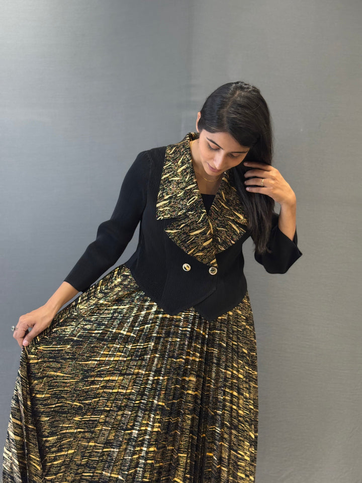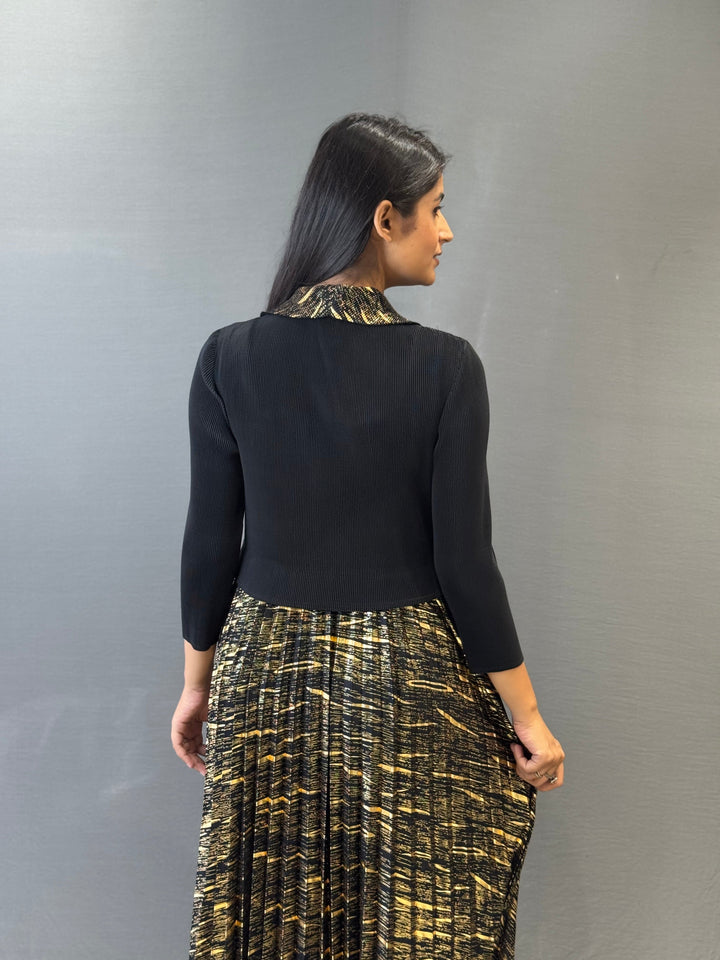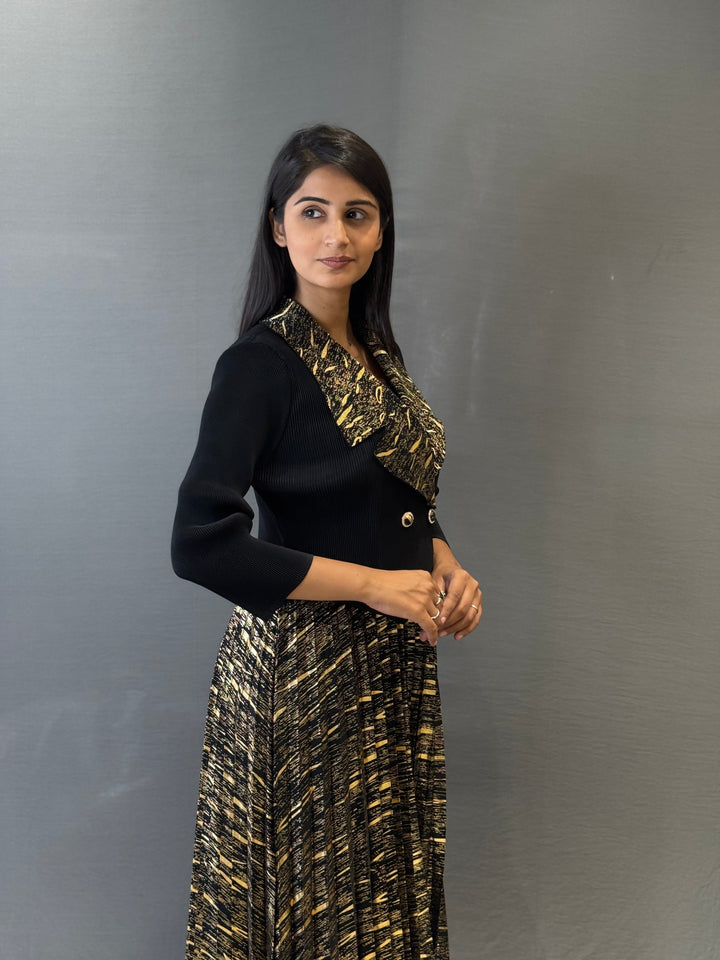 Make a bold style statement with this black and gold pleated midi dress, combining elegance with a modern twist. Key features include: