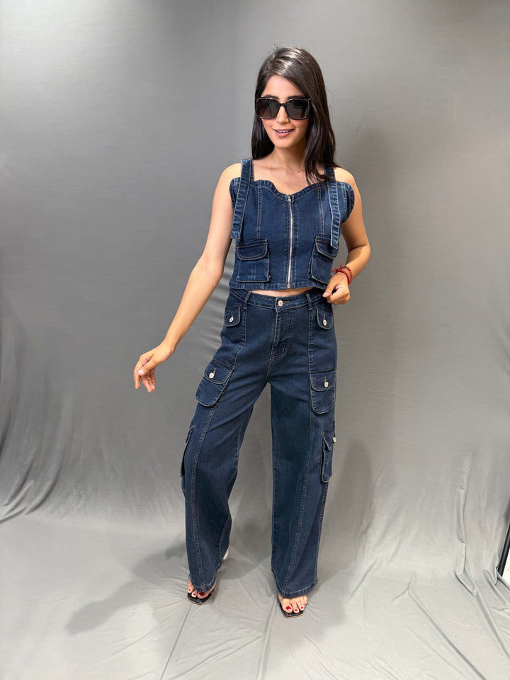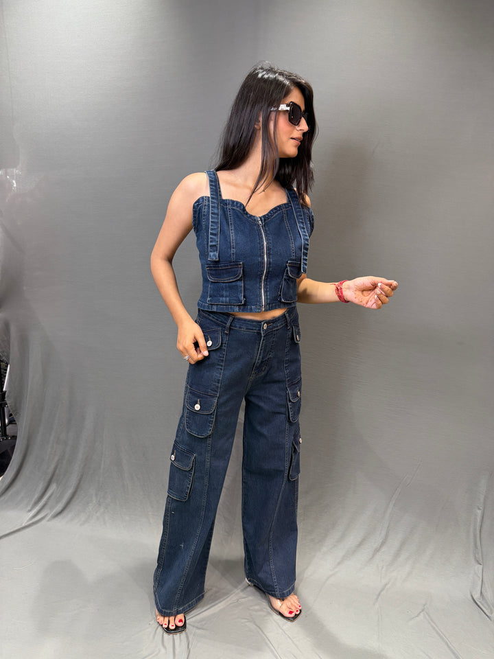 Elevate your streetwear style with this stunning dark denim co-ord set. Featuring a sleeveless crop top with front zipper closure and utility-style pocket details, it combines edgy fashion with everyday comfort. The matching high-waist cargo pants come with multiple flap pockets, offering a trendy yet practical design.