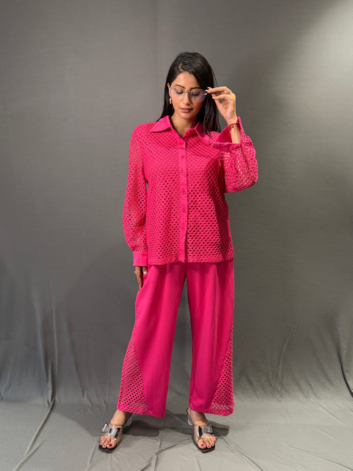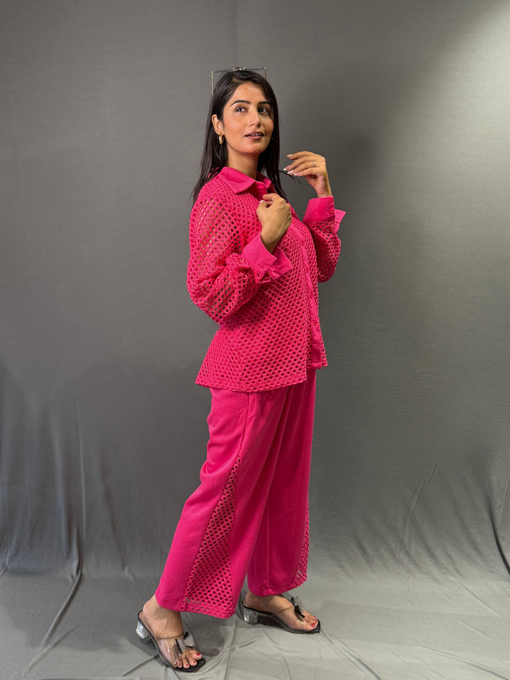 Hot Pink Textured Co-ord Set – Stylish Shirt & Wide-Leg Pants