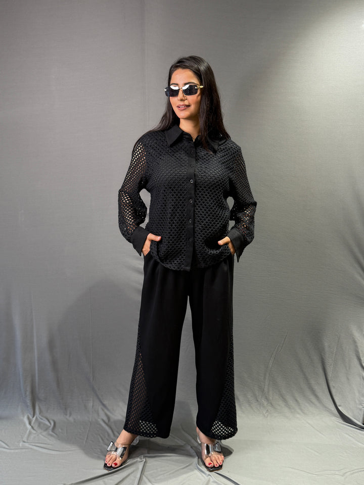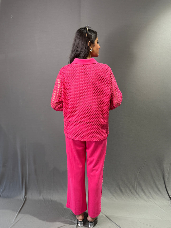 Make a bold statement with this vibrant hot pink co-ord set, featuring a textured button-down shirt paired with matching wide-leg pants. Designed for both comfort and style, this outfit is perfect for casual outings, brunch dates, or chic evening looks. The breathable fabric and trendy cutouts add a modern touch, while the coordinated design ensures effortless elegance. Pair it with heels or flats for a versatile, standout look.