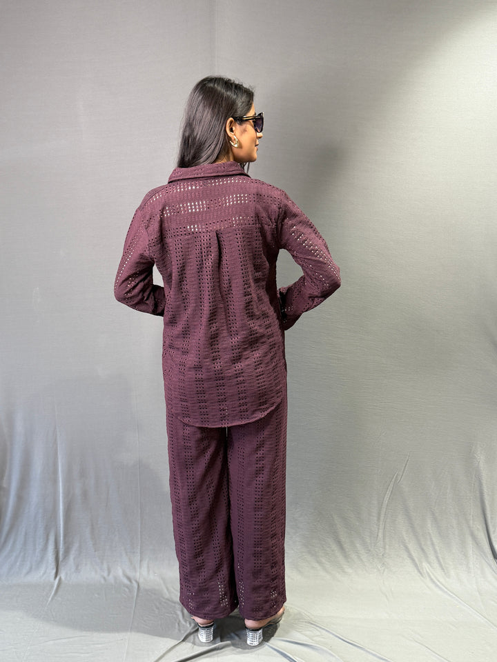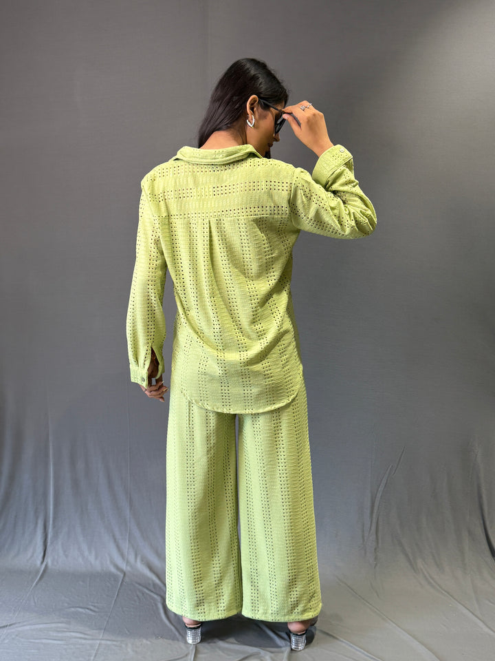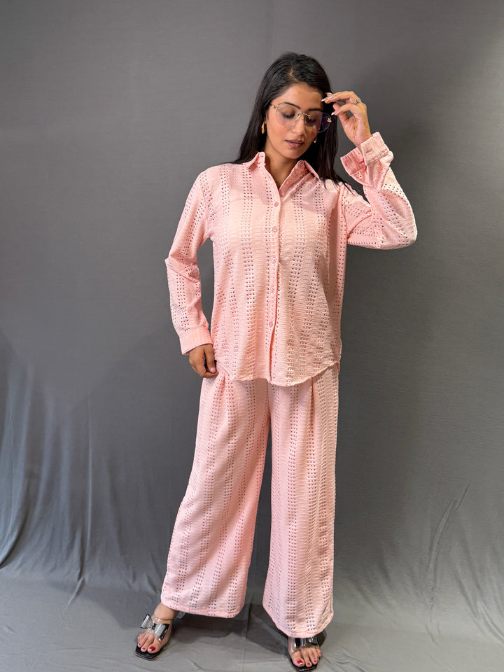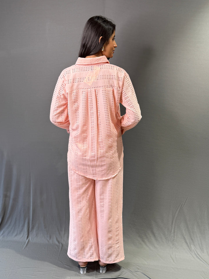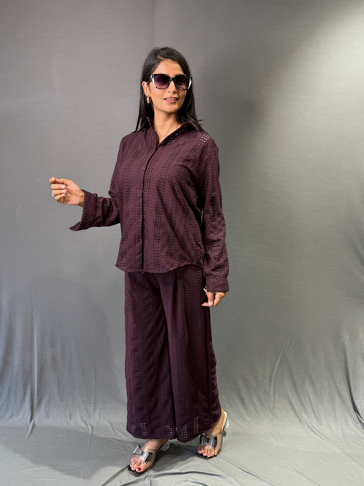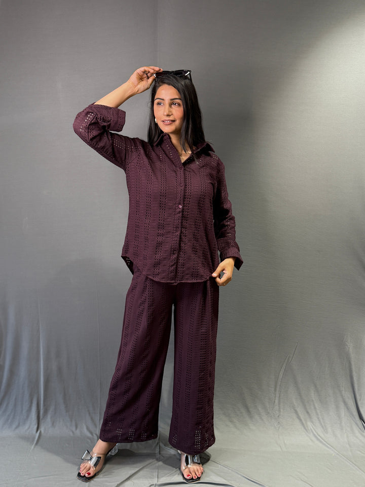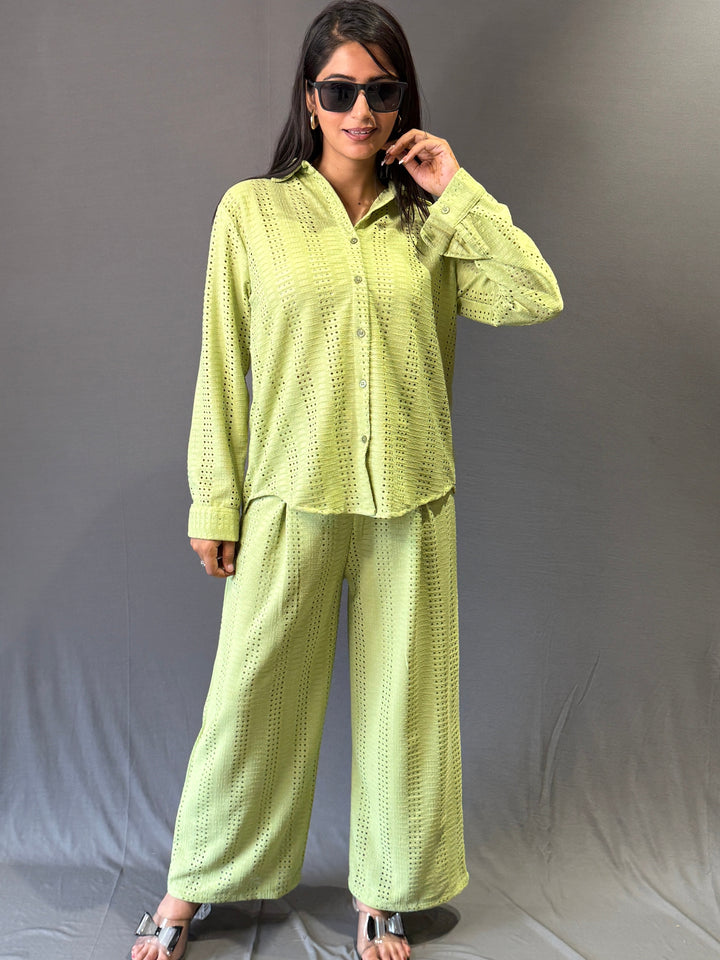 Upgrade your wardrobe with this trendy textured co-ord set, featuring a button-down shirt paired with relaxed wide-leg trousers. Designed with breathable fabric and a stylish cutwork pattern, this outfit combines comfort with modern elegance. Perfect for casual outings, brunch dates, or everyday wear, it offers versatile styling options to suit any occasion. Available in multiple colors, making it easy to pick your perfect shade and style.