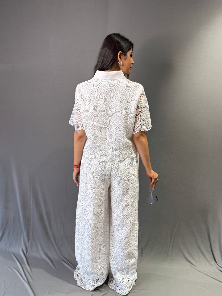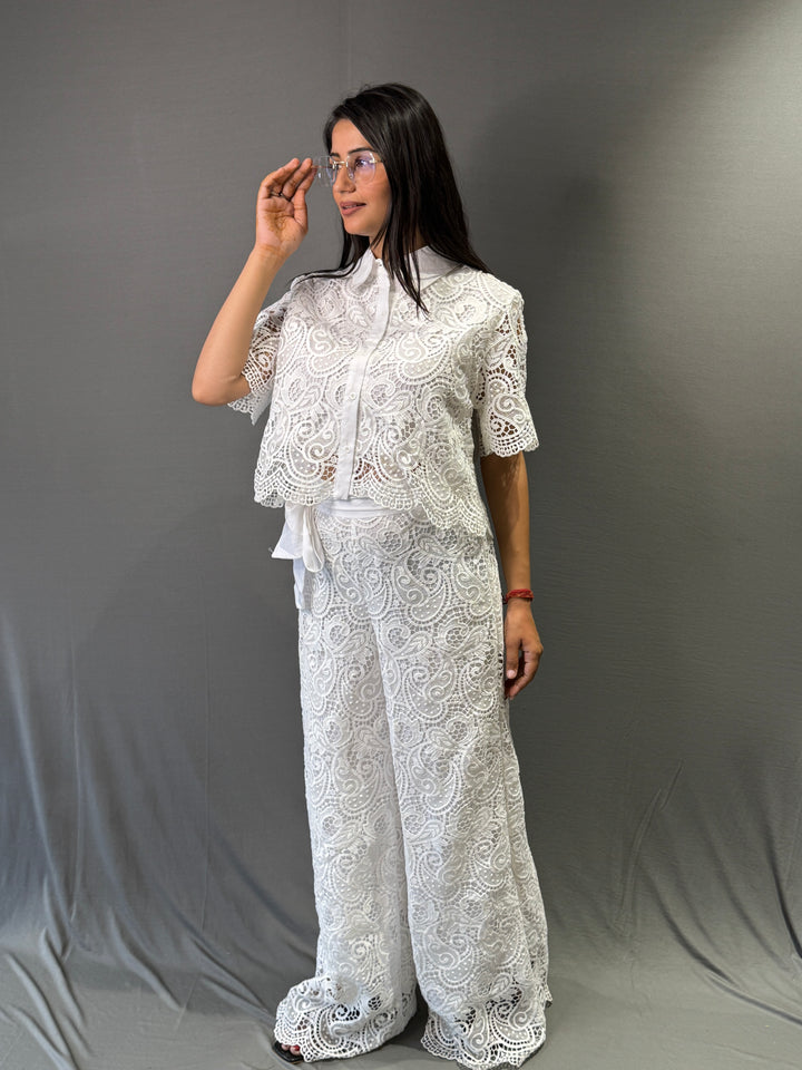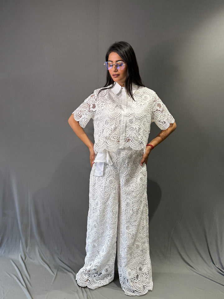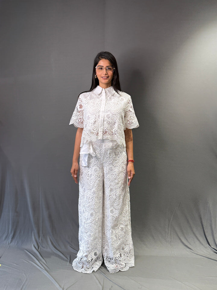 Women’s White Lace Co-ord Set – Stylish Top & Wide-Leg Pants