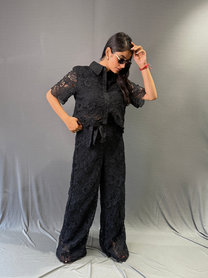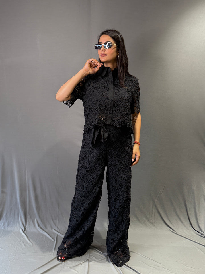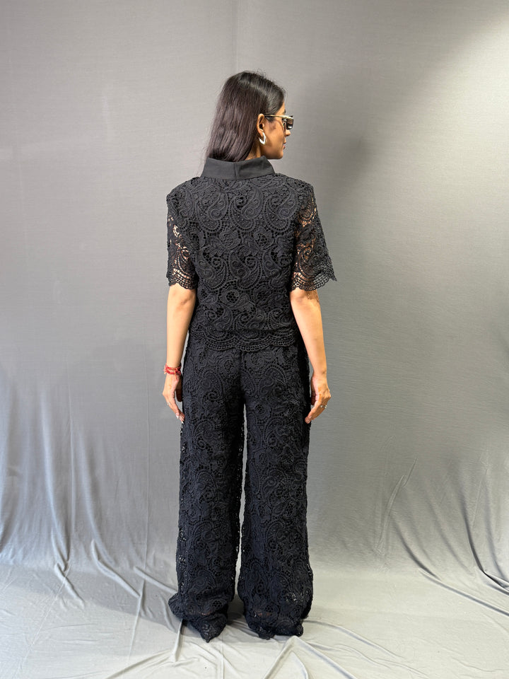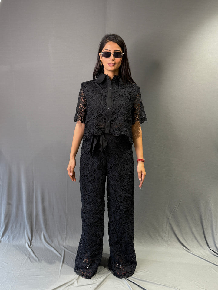 Turn heads with this stunning white lace co-ord set, featuring a short-sleeve button-down top paired with flowy wide-leg trousers. Designed with intricate lace patterns and a chic modern fit, this outfit is perfect for parties, festive gatherings, or evening events. The breathable fabric ensures comfort, while the detailed embroidery adds a luxurious touch. Style it with heels and statement jewelry for a sophisticated, standout look.