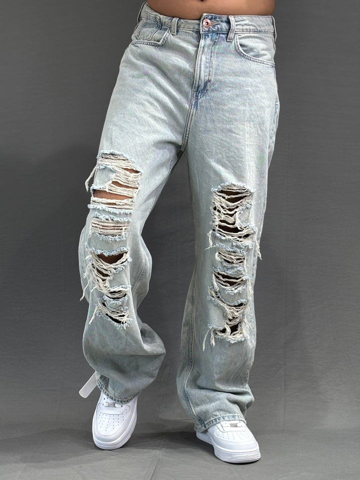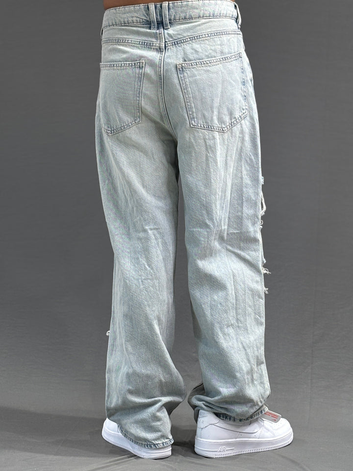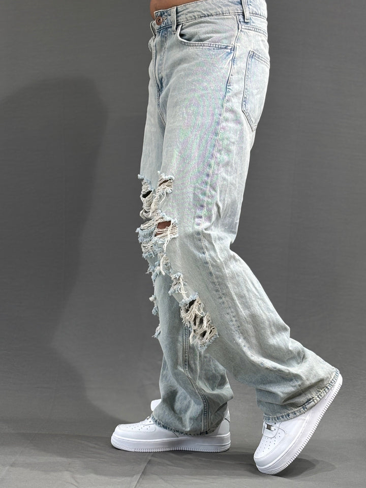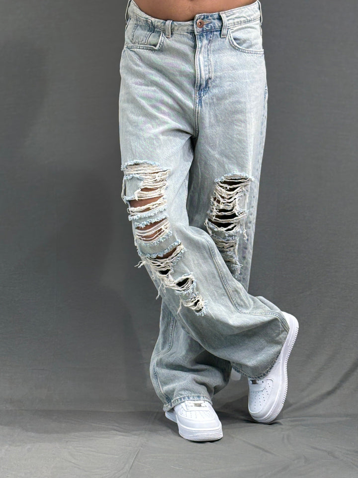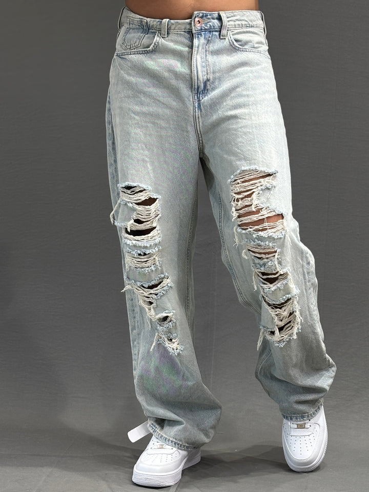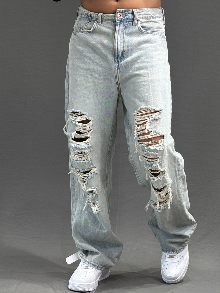 Turn heads with these Unisex Light Wash Ripped Jeans, designed for a bold, laid-back vibe. Featuring a loose fit and heavy distressed details along the front, they bring a modern streetwear edge with all-day comfort. The light blue wash gives them a vintage-inspired look that pairs effortlessly with sneakers, tees, or oversized tops. A versatile style made for everyone.