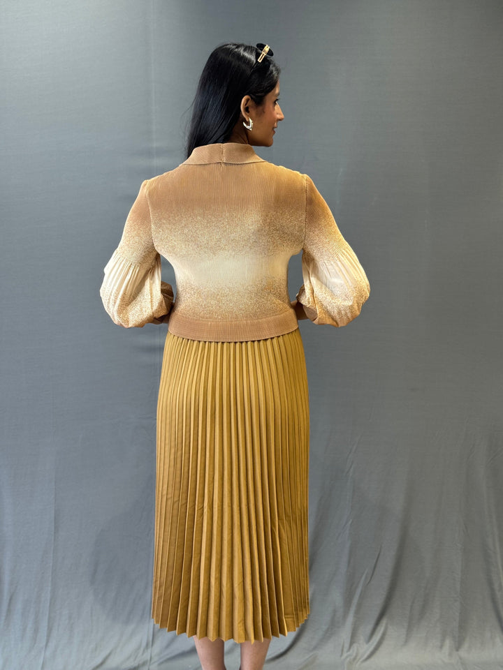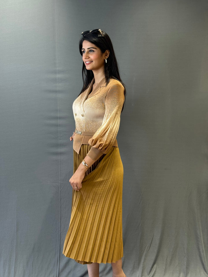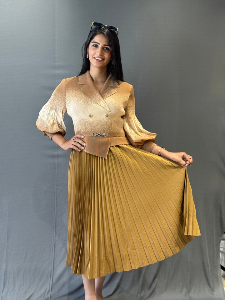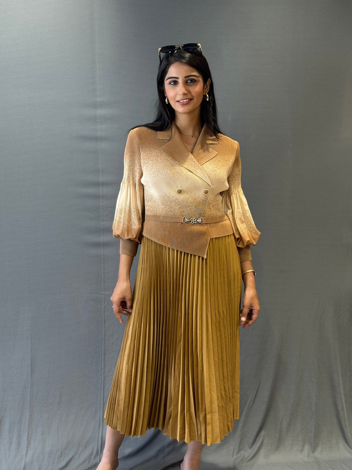 Elevate your style with this stunning golden brown ombre co-ord set, featuring a double-breasted blazer-style top with puffed pleated sleeves and a matching pleated midi skirt. The top is accented with gold-tone buttons and a chic waist belt, while the flowing skirt adds a touch of elegance. Perfect for parties, formal gatherings, and special occasions, this outfit blends sophistication with contemporary charm.