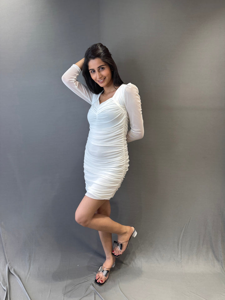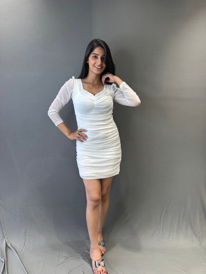 Women’s White Ruched Bodycon Mini Dress with Sheer Sleeves