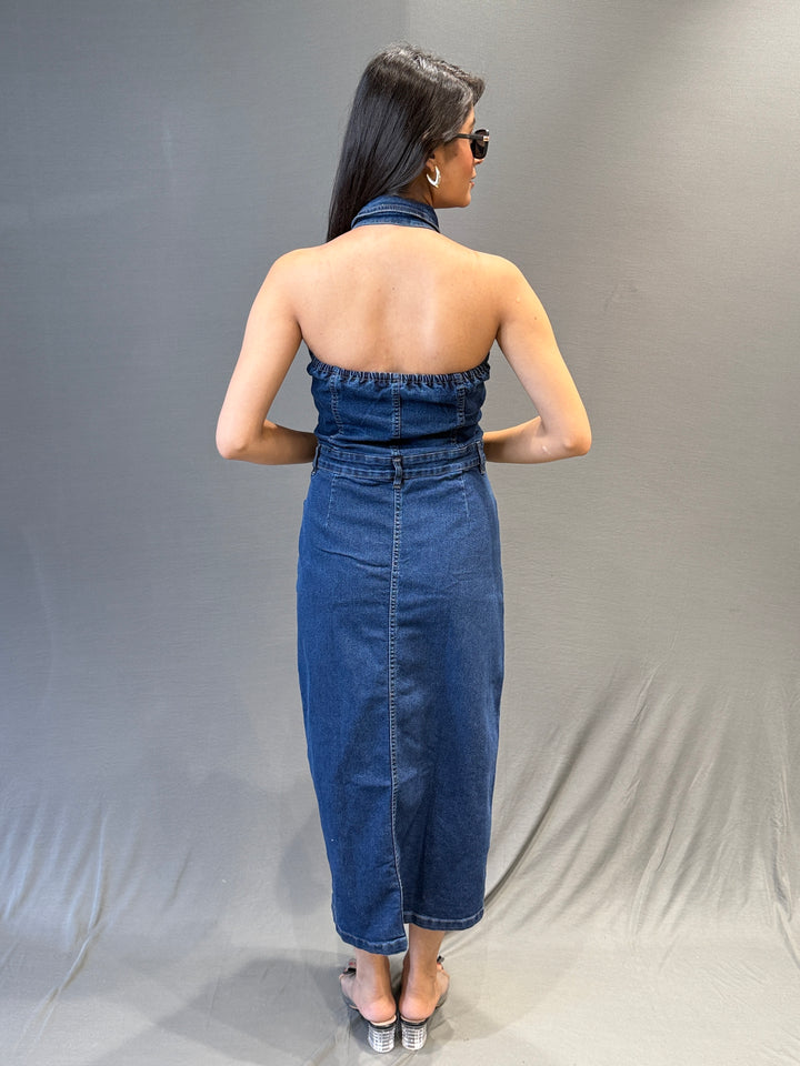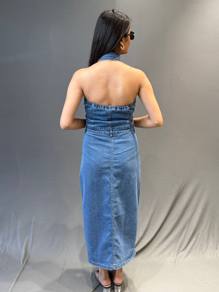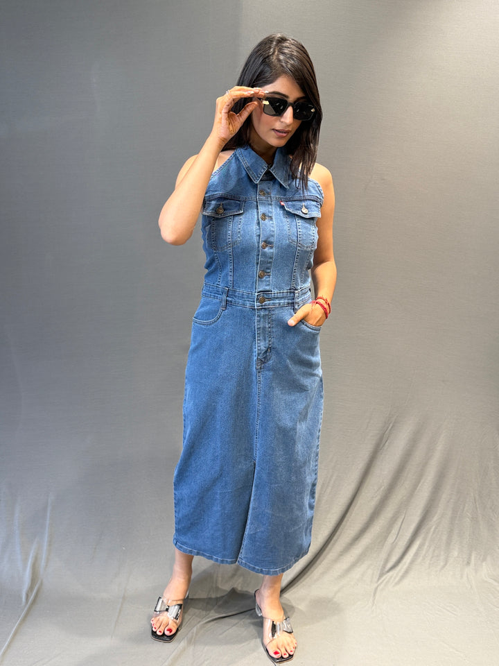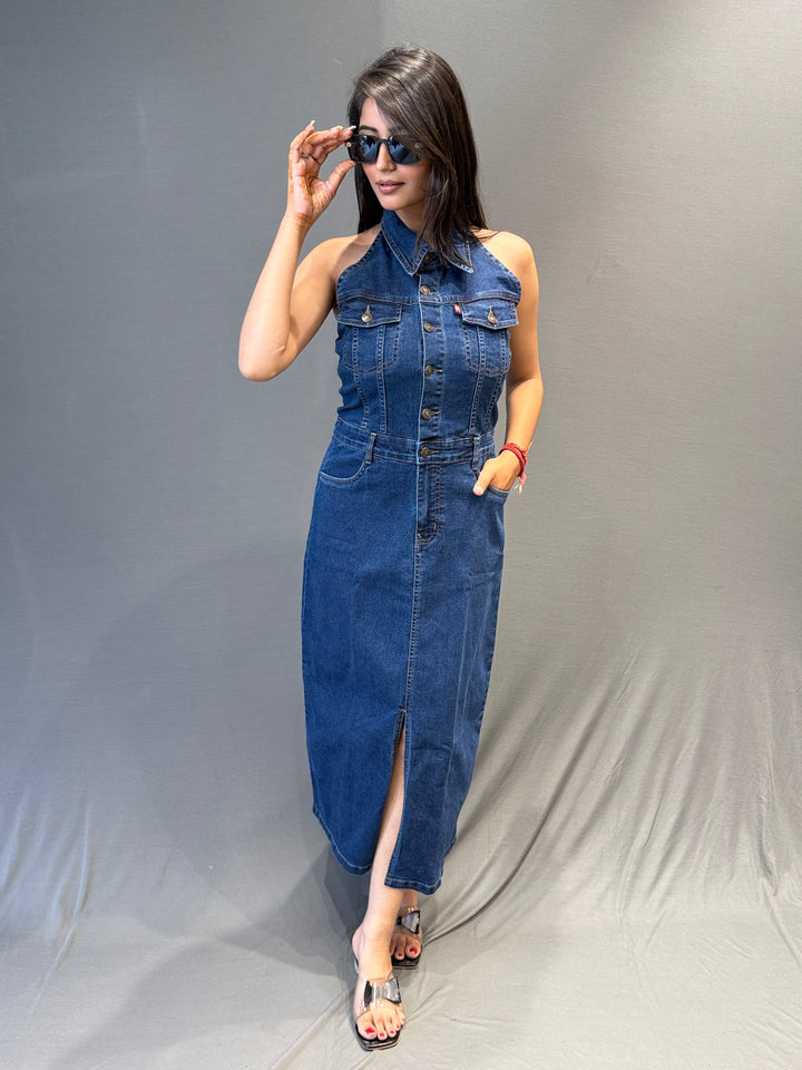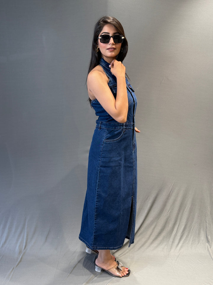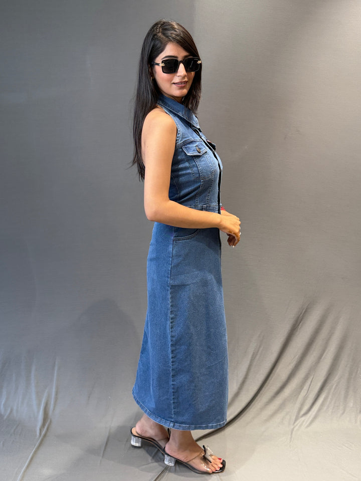 Upgrade your wardrobe with this trendy sleeveless halter neck denim midi dress, blending casual comfort with bold style. Crafted from premium denim, this dress features a button-down front, collared neckline, and functional pockets that add both utility and charm. The fitted bodice with panel stitch detailing enhances your silhouette, while the front slit at the hem allows ease of movement and a touch of elegance. Perfect for day outings, brunch dates, or casual evening looks, this dress pairs beautifully with heels, sandals, or sneakers.