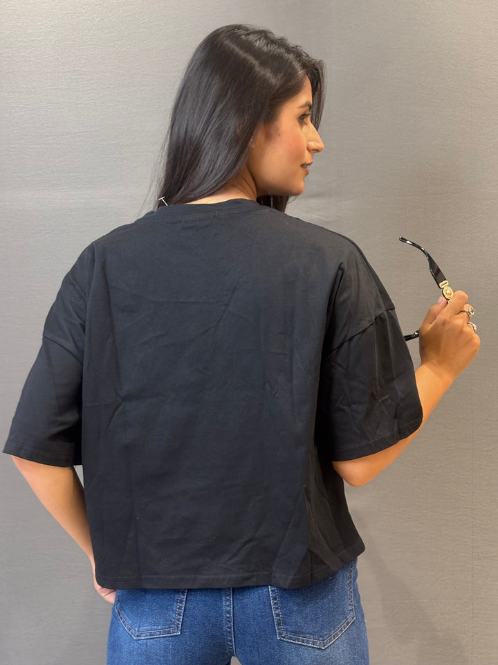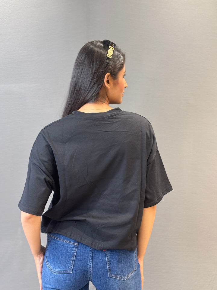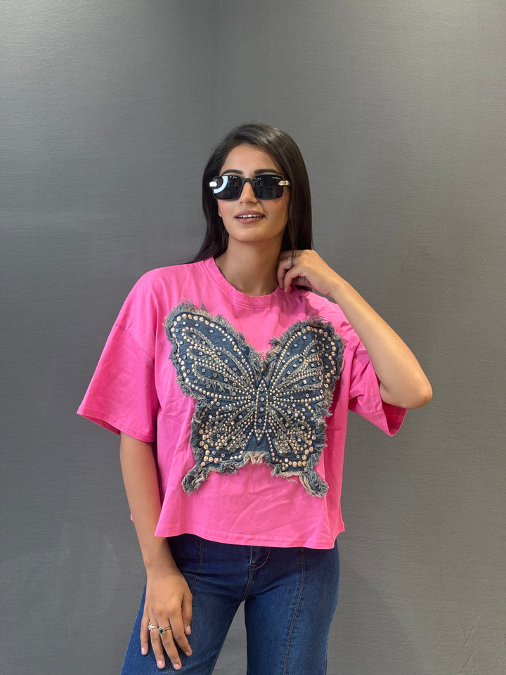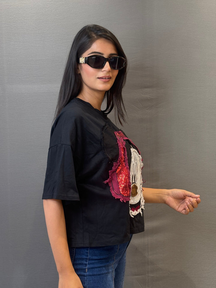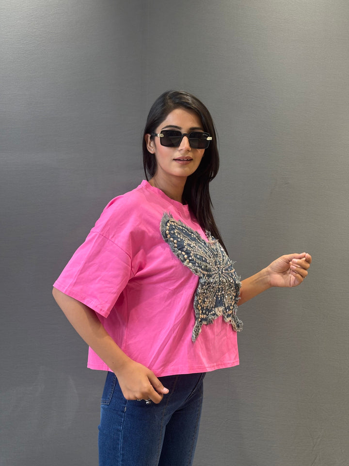 Stay effortlessly stylish with this oversized embellished patch t-shirt, designed for comfort and statement style. Made from soft, breathable fabric, it features intricate bead and pearl work on the front for a chic, standout look. Perfect for pairing with jeans, shorts, or skirts, this versatile tee comes in multiple designs and colors to match your mood and outfit. Ideal for casual outings, coffee dates, or relaxed weekends.