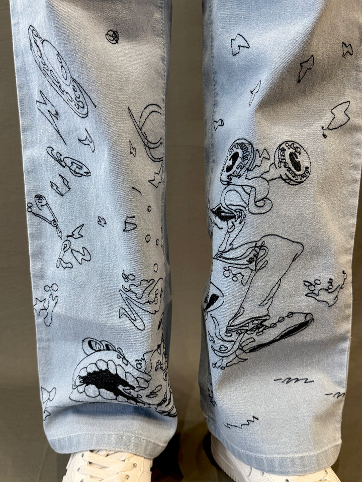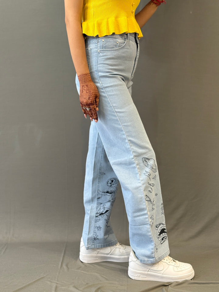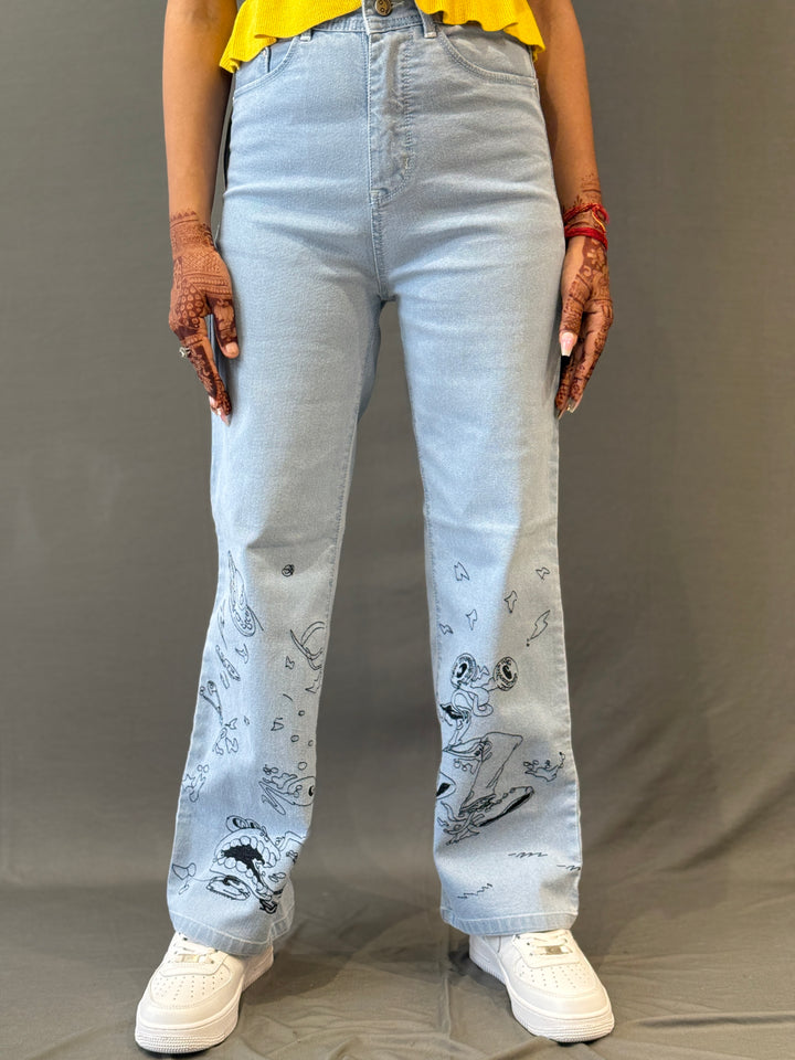 Make a bold statement with these light blue high-waist straight-leg jeans featuring eye-catching black graphic prints along the legs. The playful artwork adds a unique streetwear vibe to your everyday denim, while the light wash keeps the look fresh and versatile.