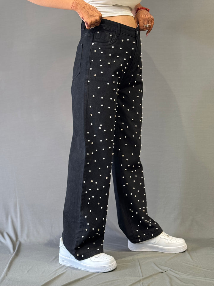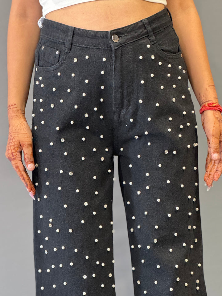 Black Wide-Leg Jeans with All-Over Pearl Embellishments