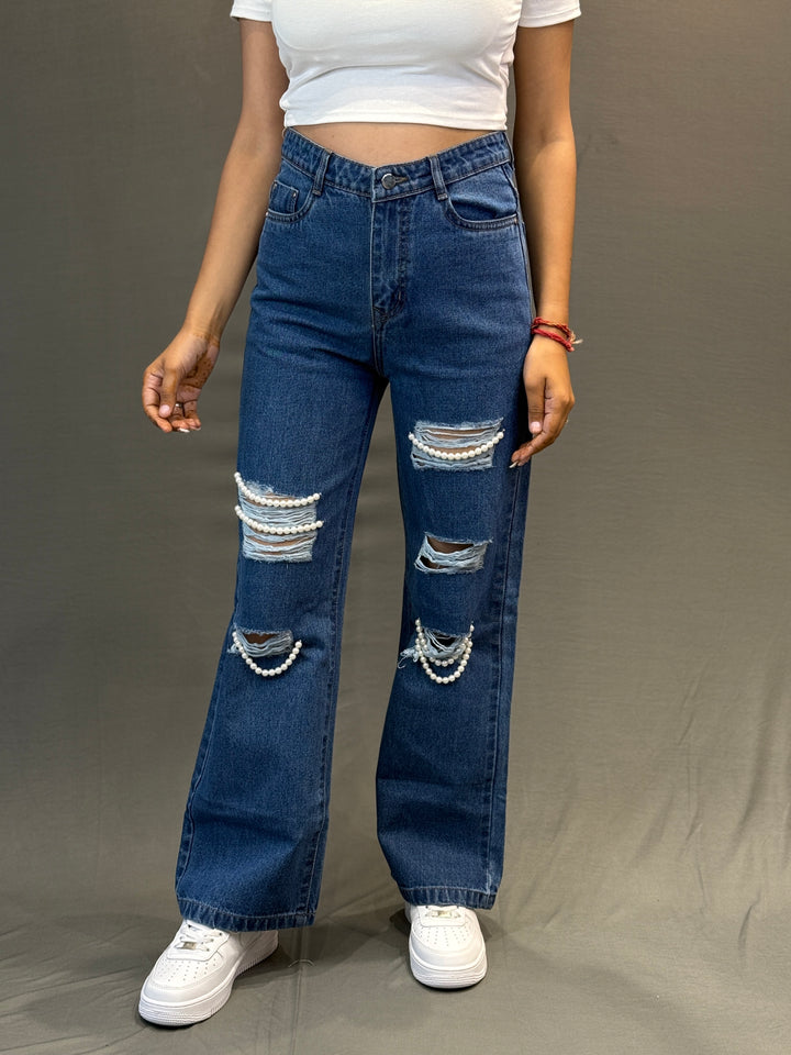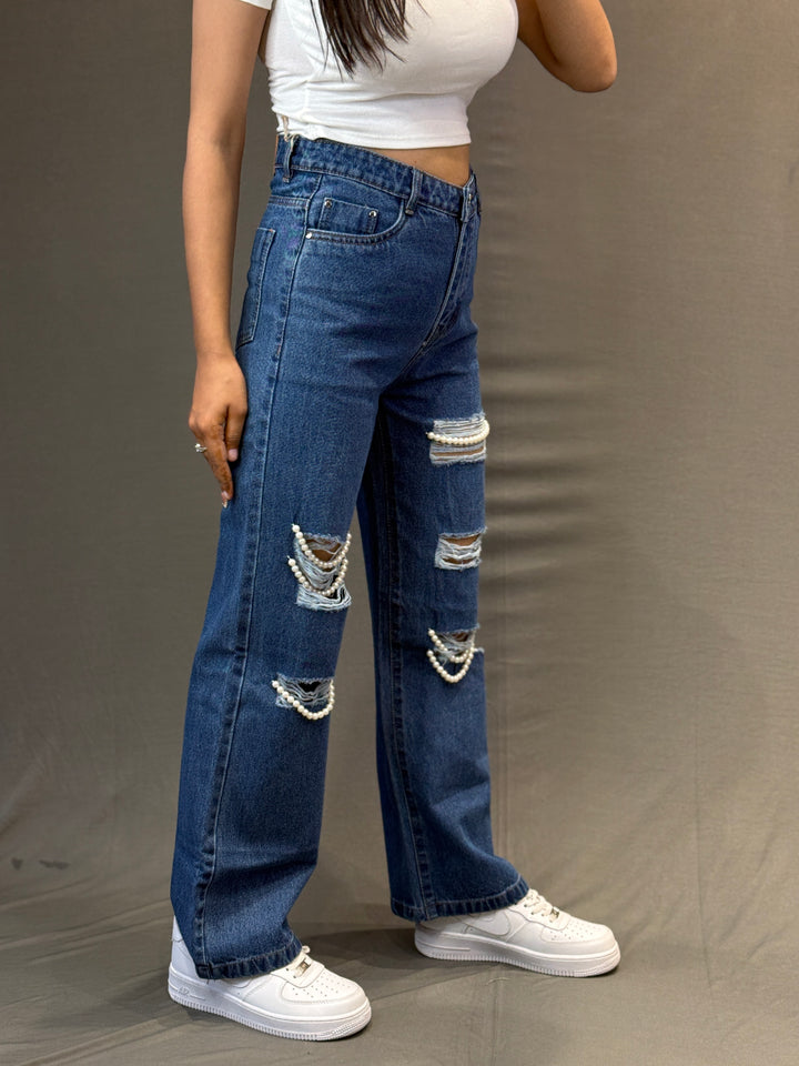 Turn heads with these dark blue ripped jeans, designed with a stylish twist – pearl chain embellishments on distressed patches. The high-waist fit and straight-leg cut make them flattering and comfortable, while the pearl details add a chic and feminine vibe to edgy streetwear.