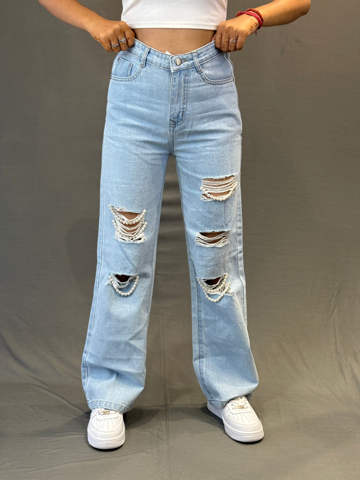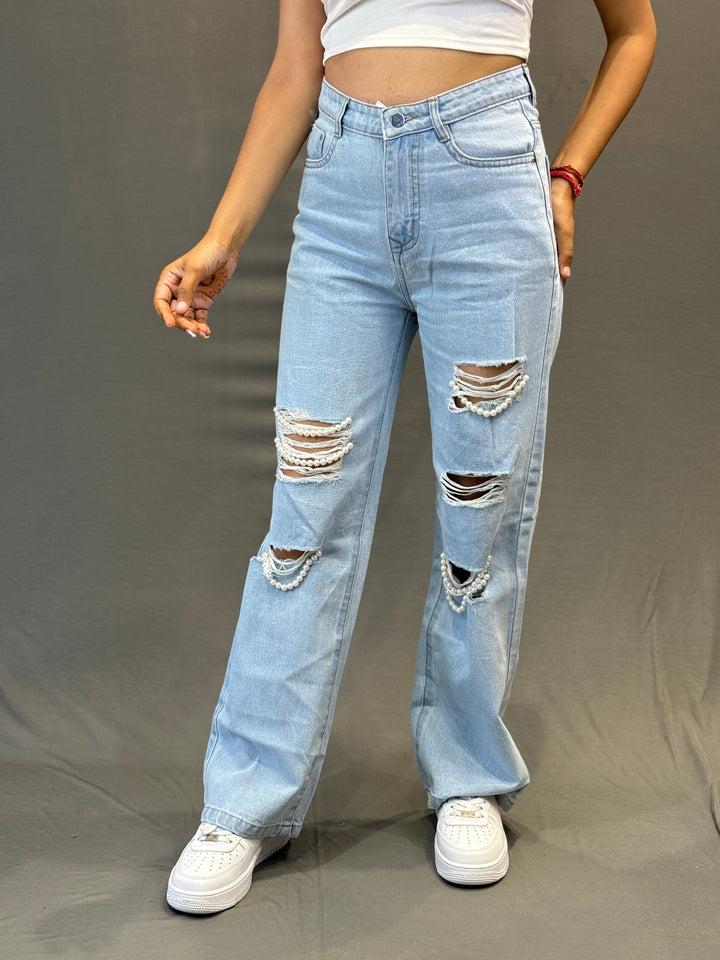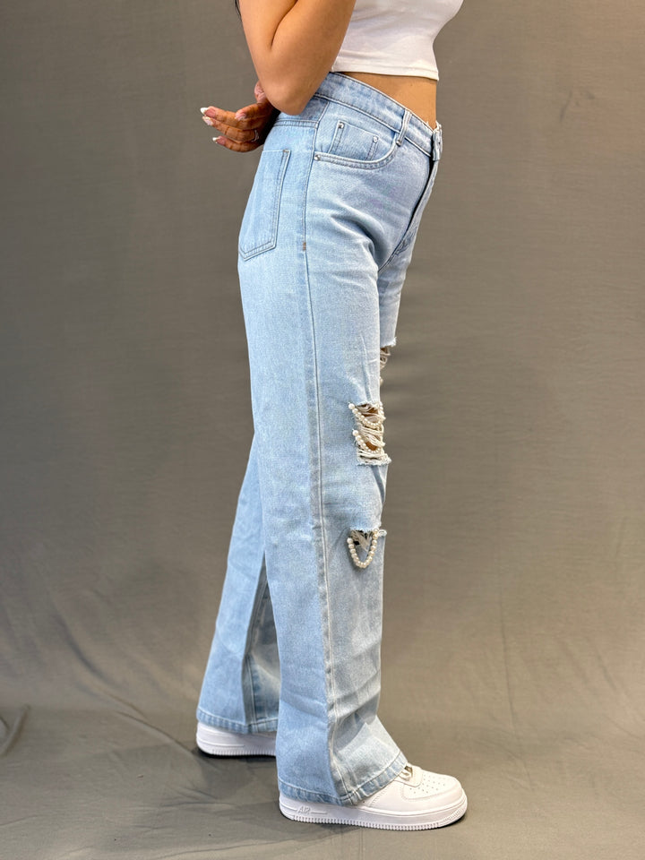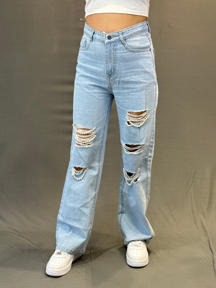 Women’s Ripped Denim Jeans with Pearl Detailing
