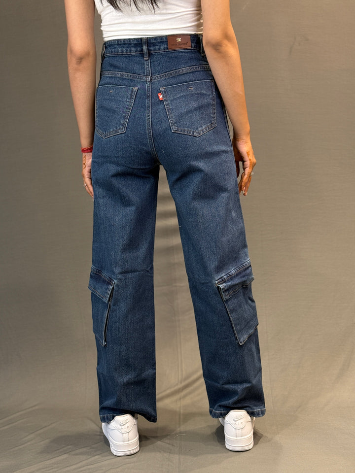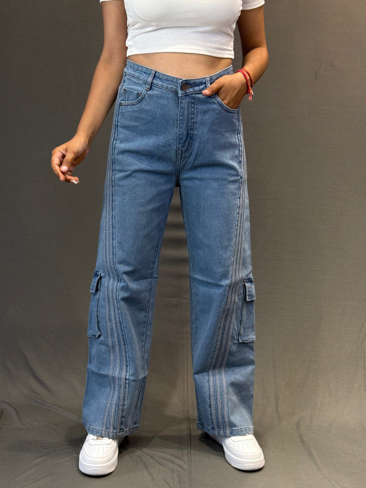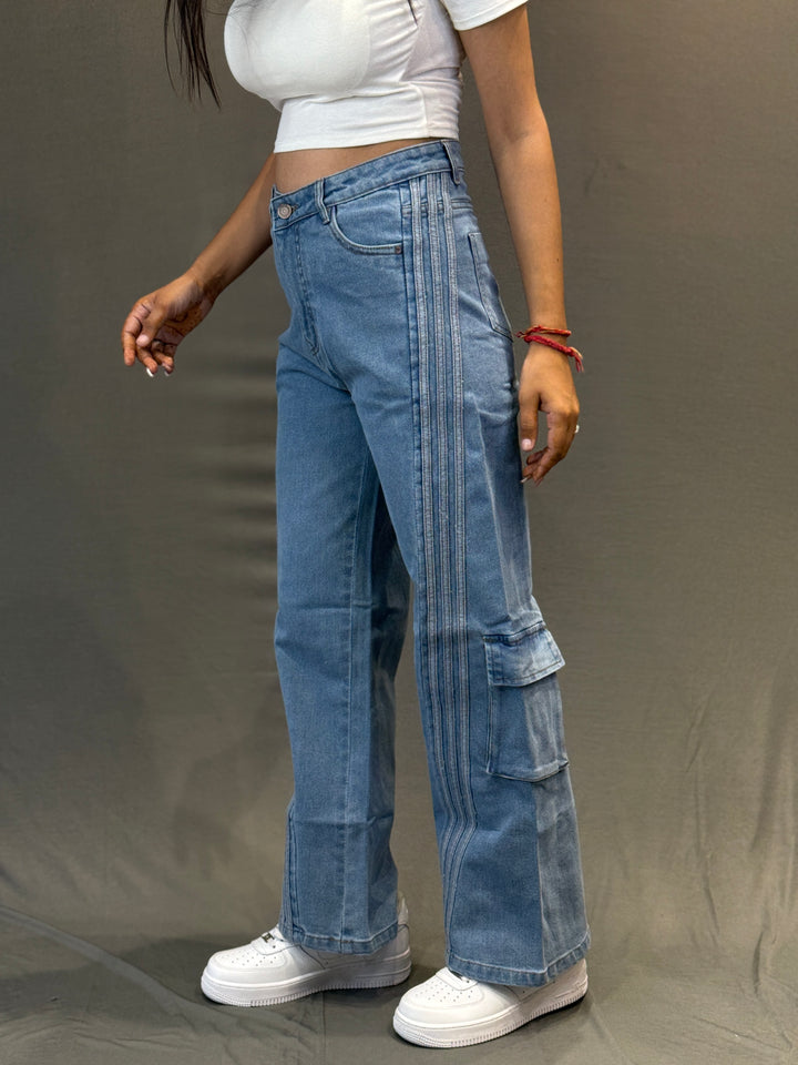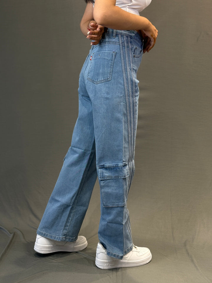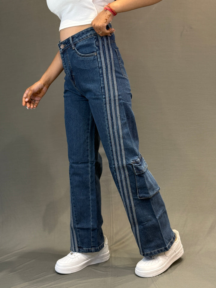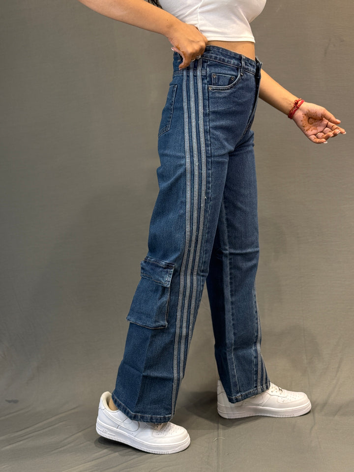 Step up your casual style with these dark blue high-waist cargo jeans, designed with trendy vertical stripe detailing along the legs. The wide-leg fit and side cargo pockets add a modern streetwear vibe, making them both stylish and functional.