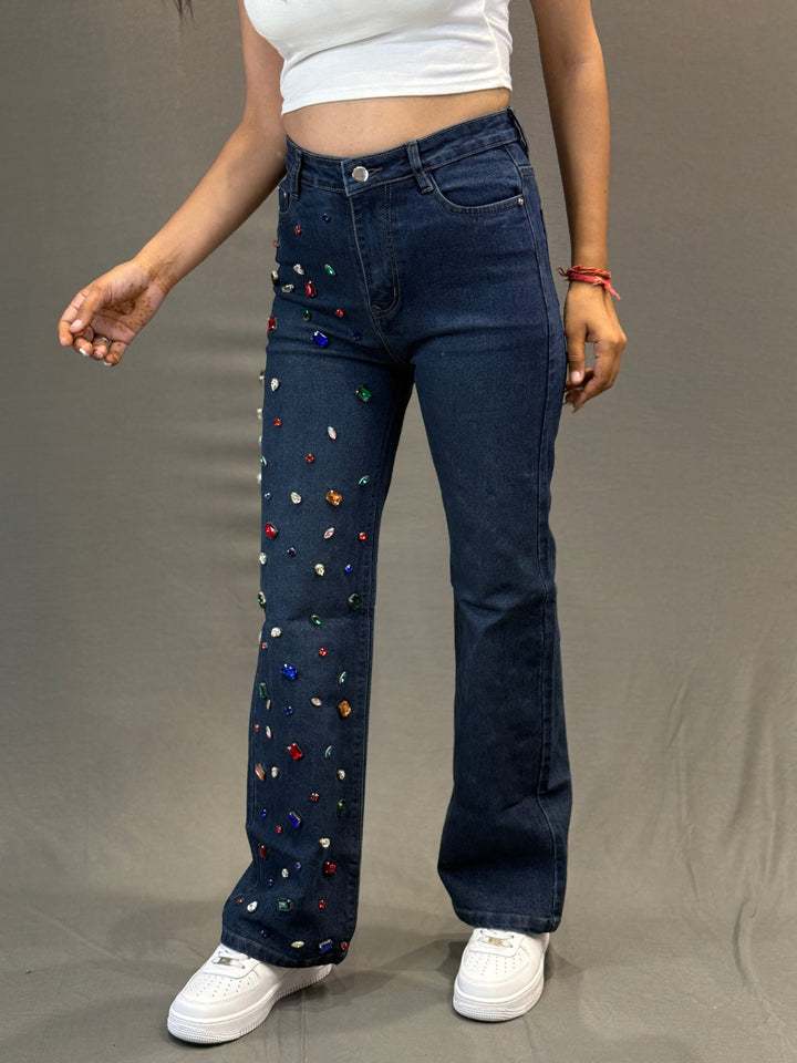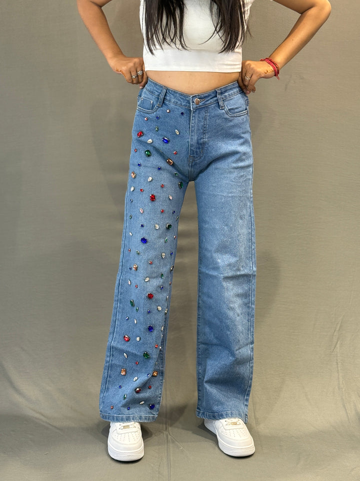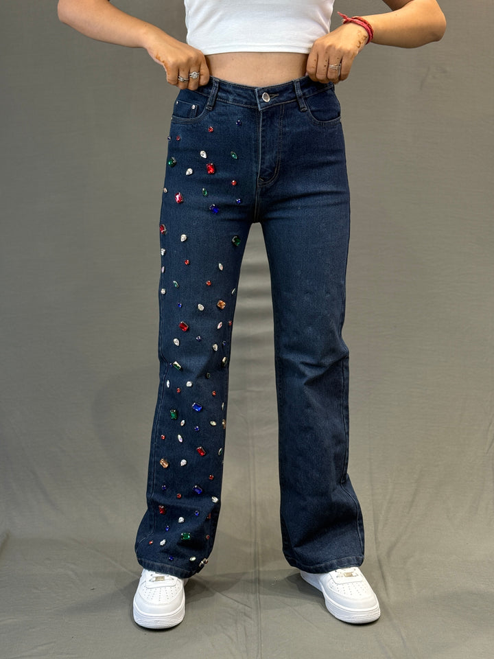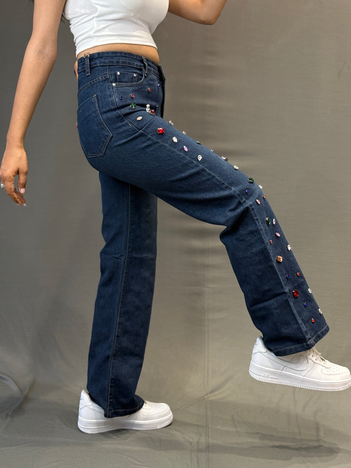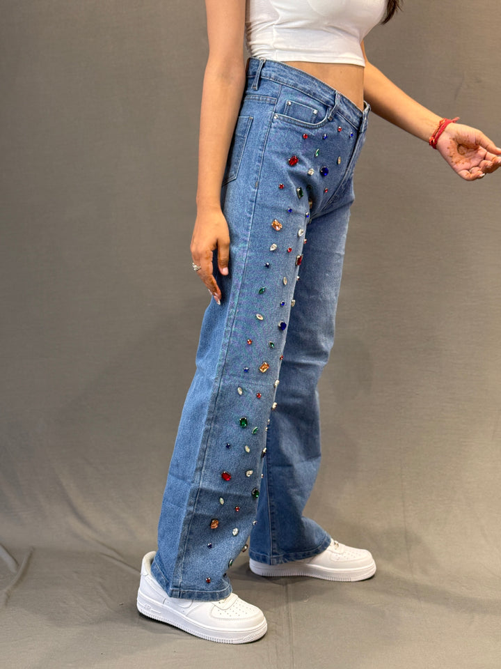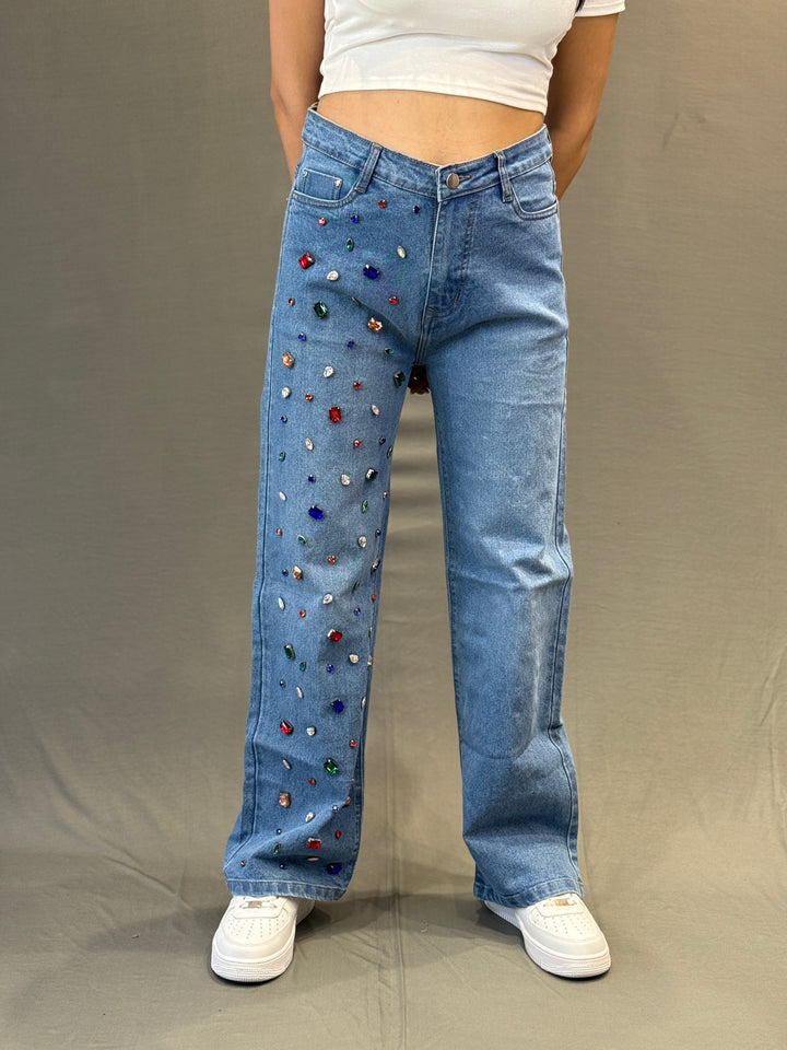 Make a bold statement with these stunning embellished denim jeans. Designed with a classic straight-leg fit, these jeans combine timeless style with modern flair. One leg is adorned with multicolored gem-like embellishments that add sparkle and dimension, while the other leg stays sleek and minimal for a chic contrast.