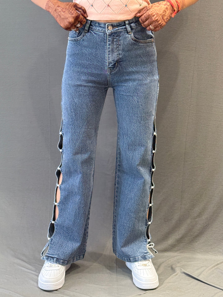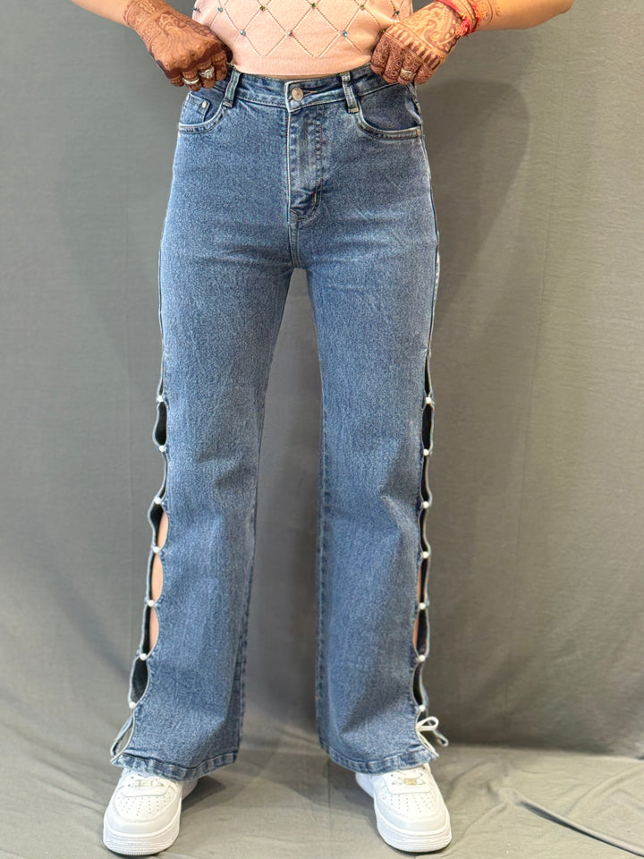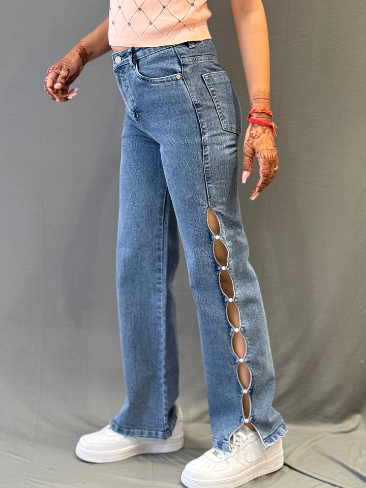 Step up your denim game with these trendy high-waist straight-cut jeans featuring a bold side cut-out design. The unique scalloped cut-outs run along the outer leg, accented with pearl button embellishments, giving you the perfect mix of edgy and chic. Made with premium quality denim, these jeans offer comfort and durability while making a strong fashion statement.