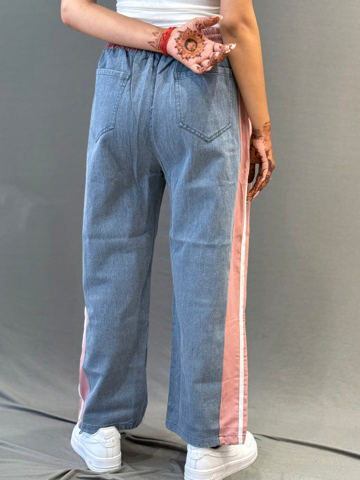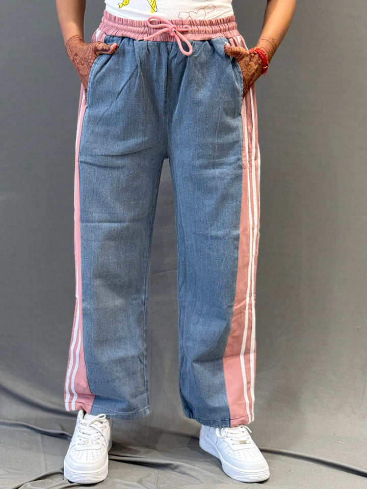 Stay comfy and stylish with these denim jogger pants featuring bold pink side panels accented with sporty white stripes. Designed with a relaxed fit, elastic waistband, and adjustable drawstring, these joggers combine streetwear vibes with casual comfort. The denim body adds durability, while the contrast side paneling gives a trendy, athletic-inspired look.