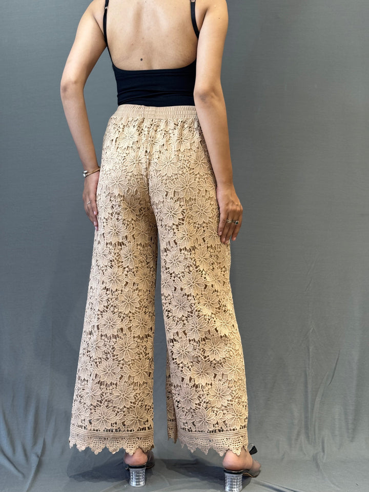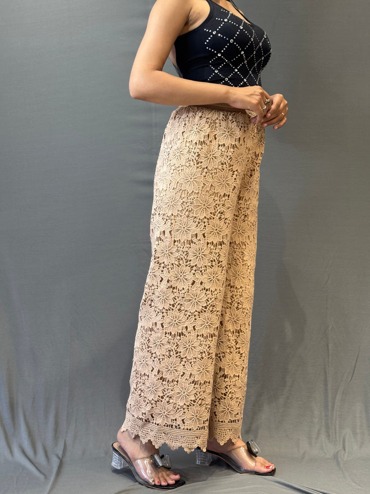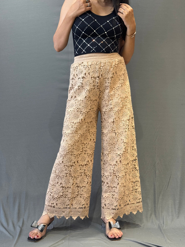 Elegant Beige Floral Lace Palazzo Pants – Free Size (Fits S to XL)