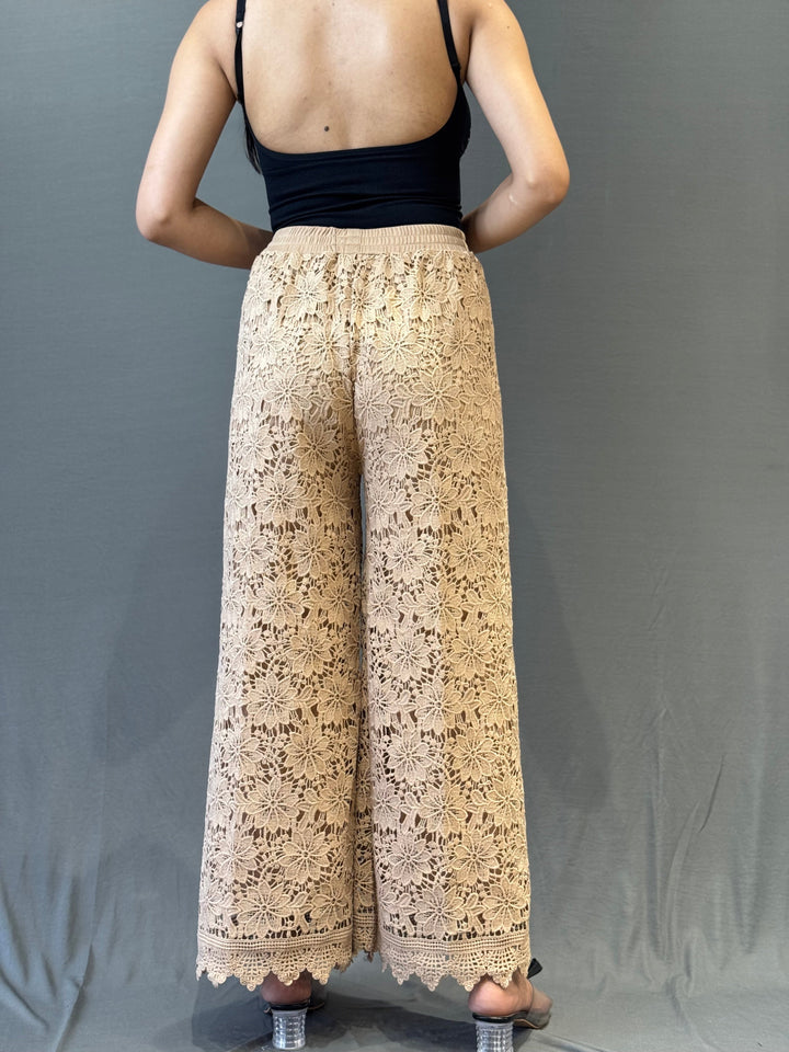 Add a refined touch to your wardrobe with these beige floral lace palazzo pants. Featuring intricate floral lace patterns and a soft inner lining, they combine elegance with everyday comfort. The relaxed wide-leg silhouette flows beautifully, while the elastic waistband ensures a perfect fit for various body shapes. A delicate scalloped hem completes the look, making these pants perfect for casual outings, holiday wear, or evening get-togethers.