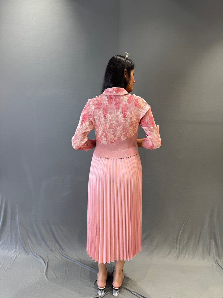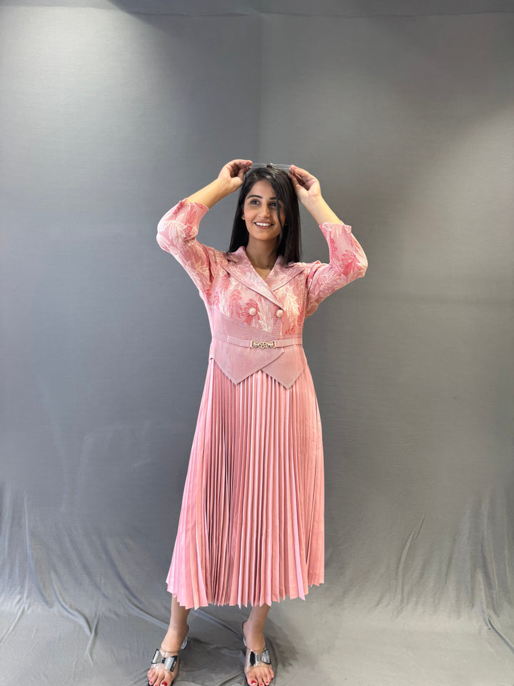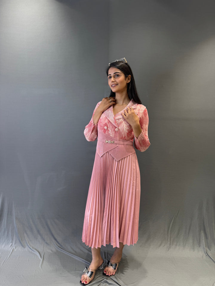 Women’s Pink Pleated Midi Dress with Textured Blazer Bodice