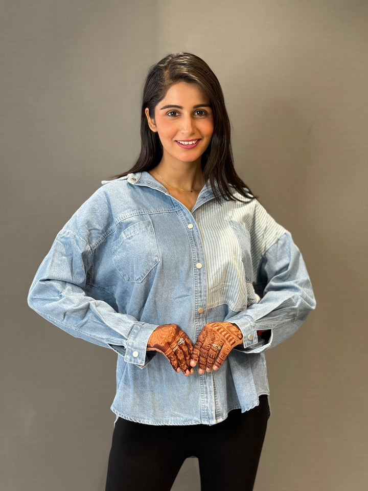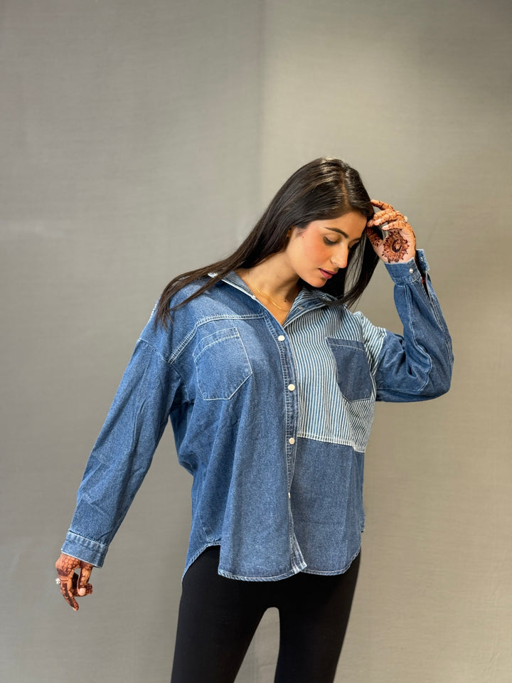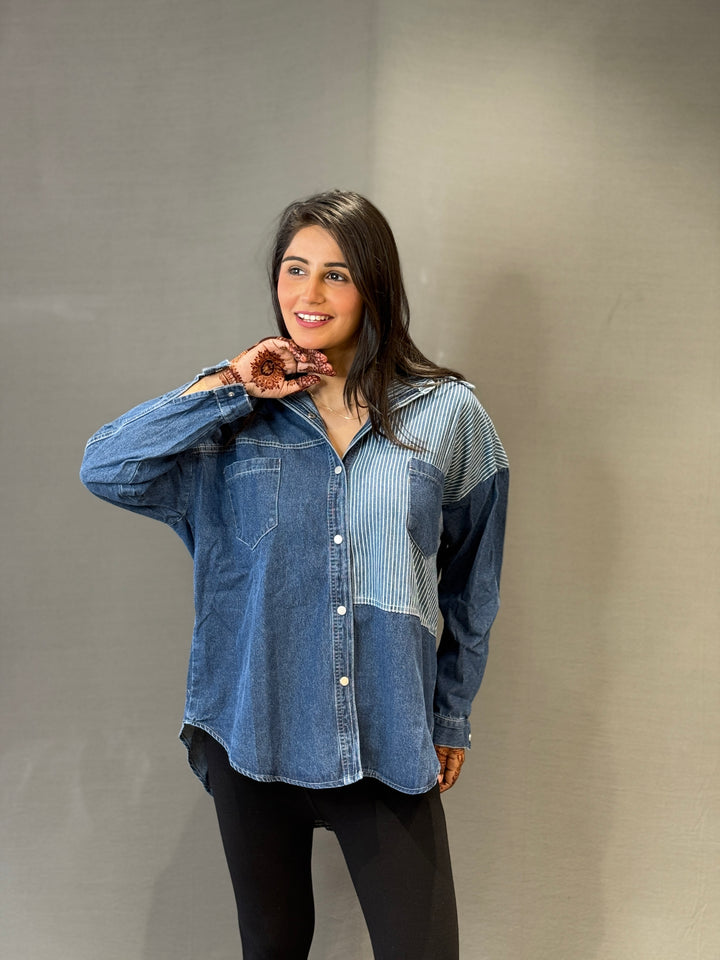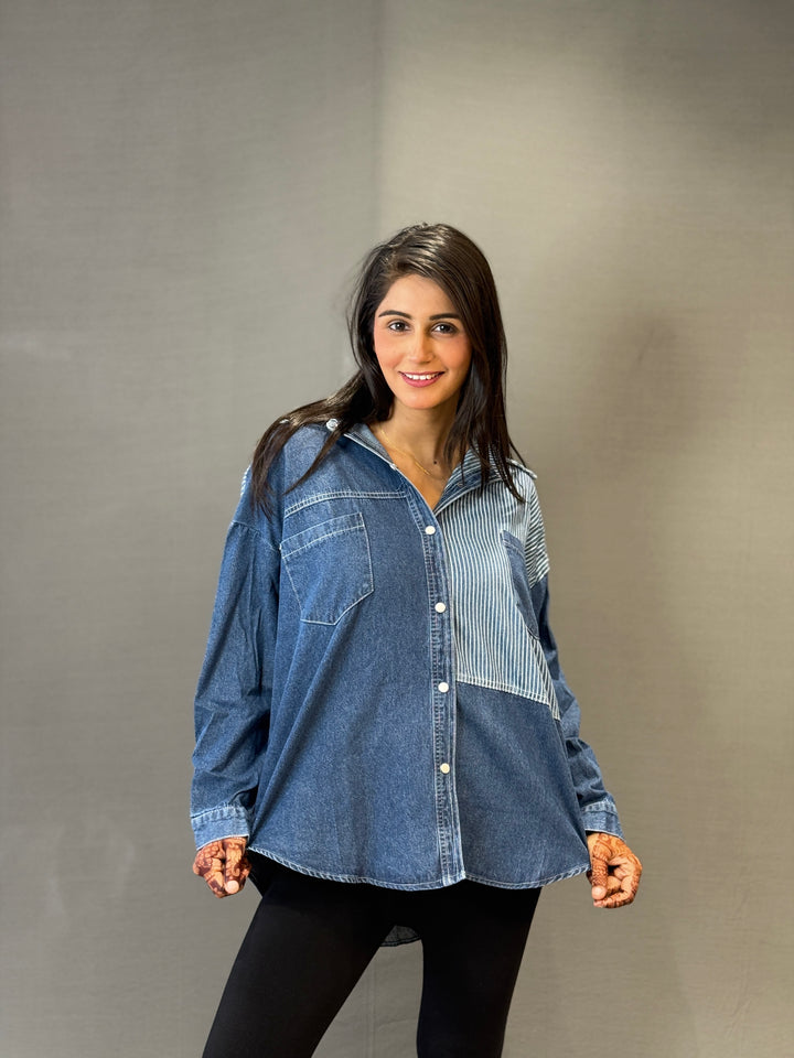 Upgrade your casual wardrobe with this two-tone denim shirt, blending classic denim with chic striped detailing. Designed with a relaxed oversized fit, button-down front, and chest pocket, this shirt offers the perfect balance of comfort and style. Wear it as a shirt, layer it over a tank, or style it as a light jacket — this versatile piece is a must-have for effortless everyday looks.