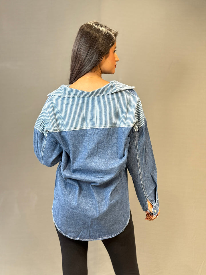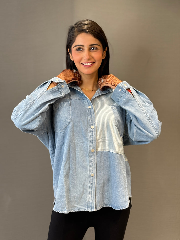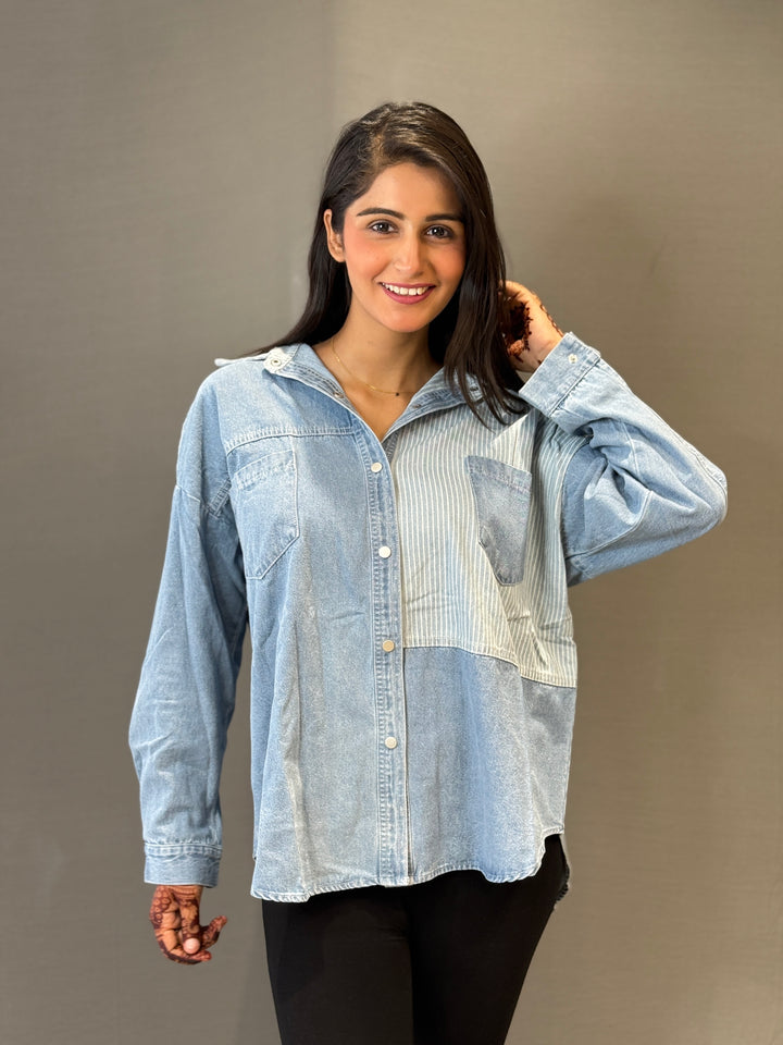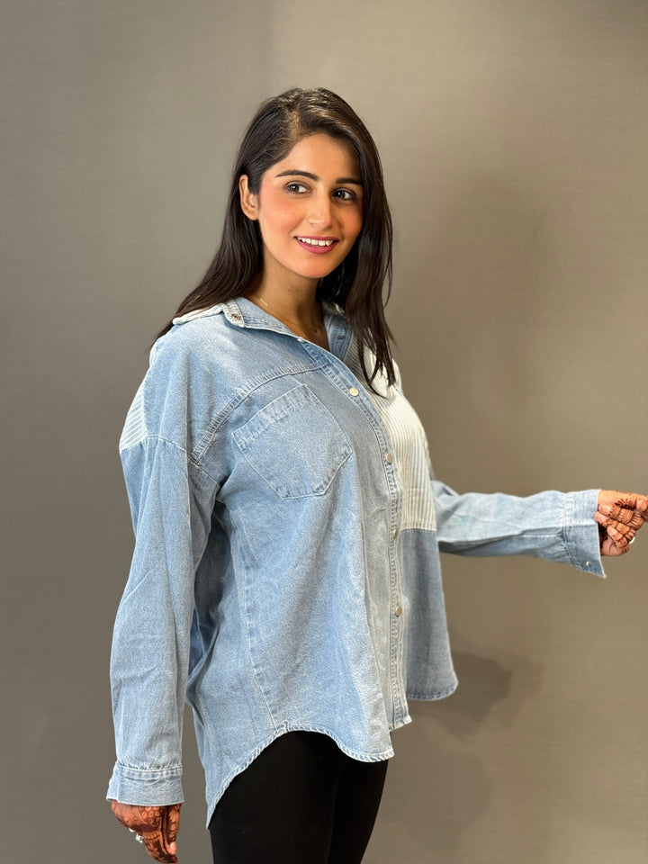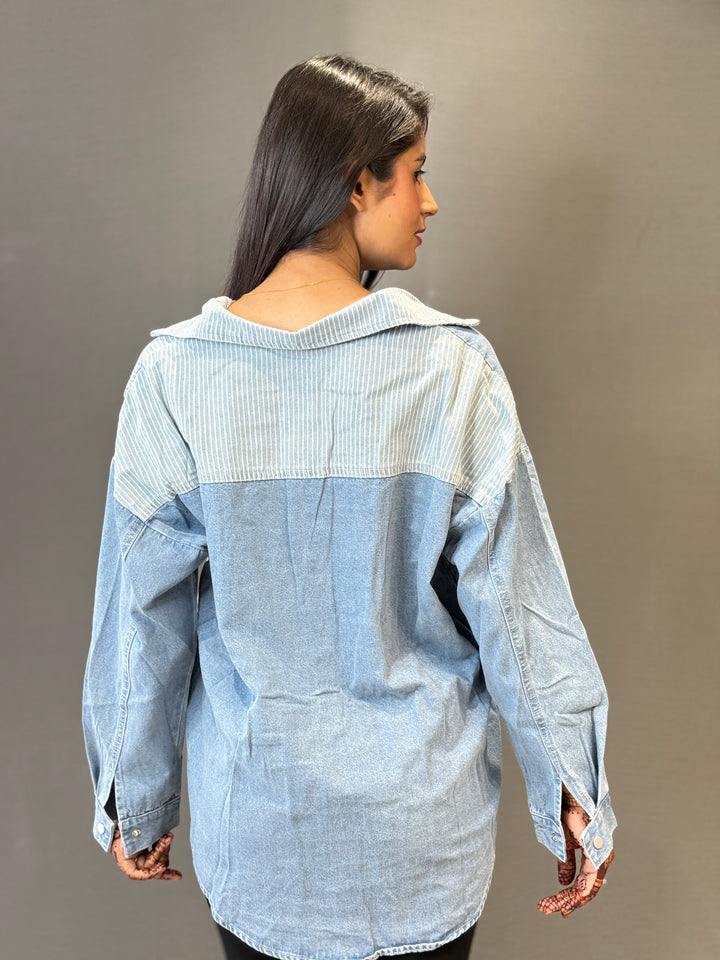 Upgrade your casual wardrobe with this two-tone denim shirt, blending classic denim with chic striped detailing. Designed with a relaxed oversized fit, button-down front, and chest pocket, this shirt offers the perfect balance of comfort and style. Wear it as a shirt, layer it over a tank, or style it as a light jacket — this versatile piece is a must-have for effortless everyday looks.