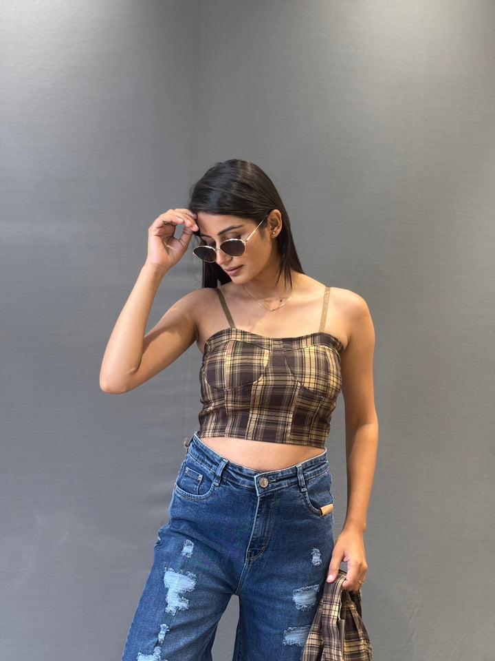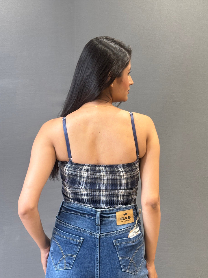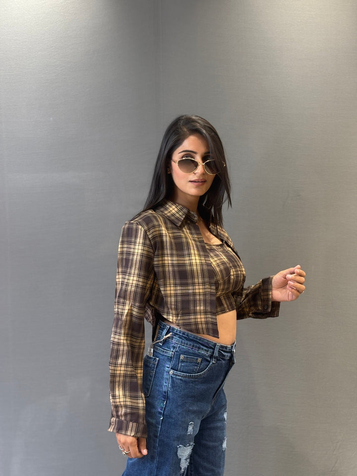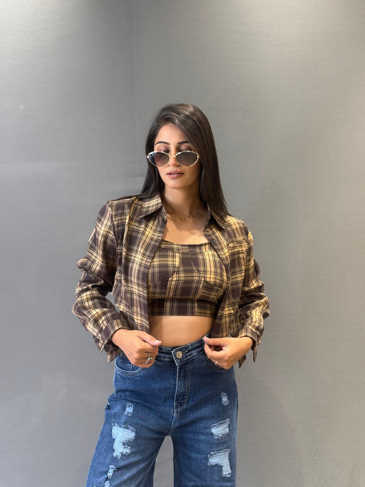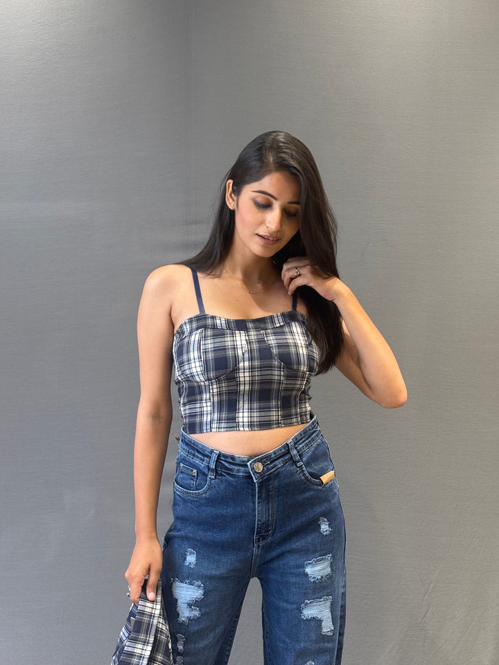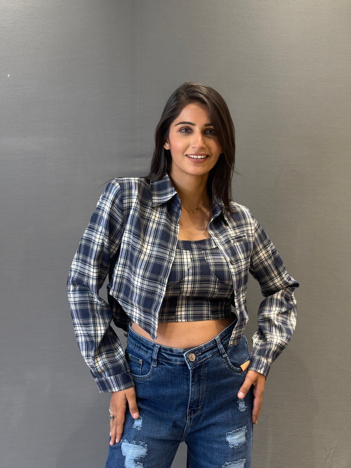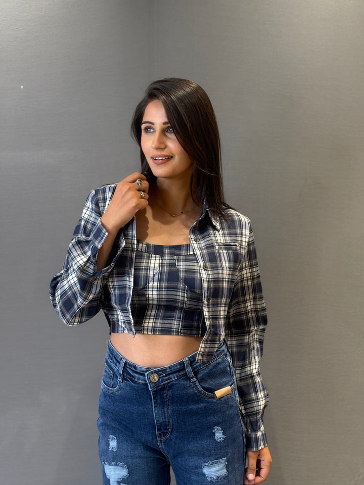 Step up your style game with this chic navy plaid crop top, perfect for the semi-winter season. Crafted from soft, warm fabric, it features a classic checkered pattern that blends casual comfort with a modern silhouette. Whether worn solo or layered with a matching overshirt, it’s the ultimate choice for an effortlessly stylish look.
