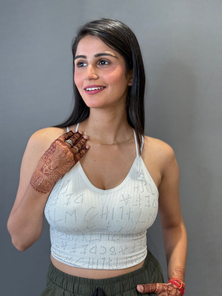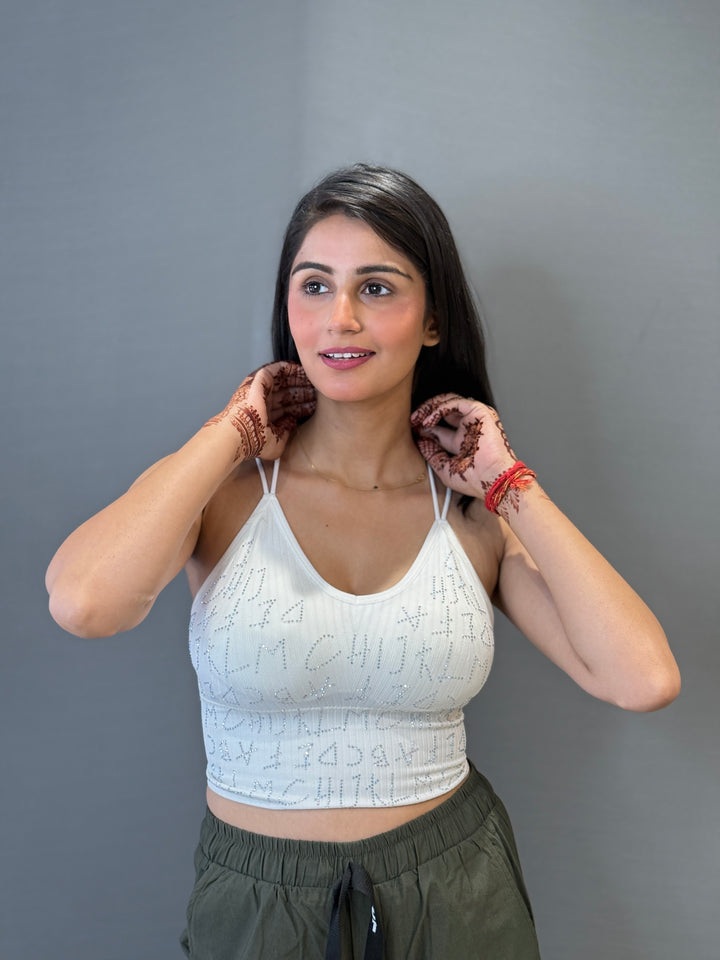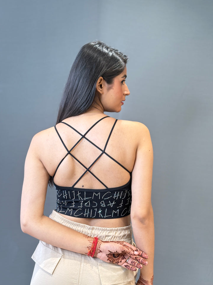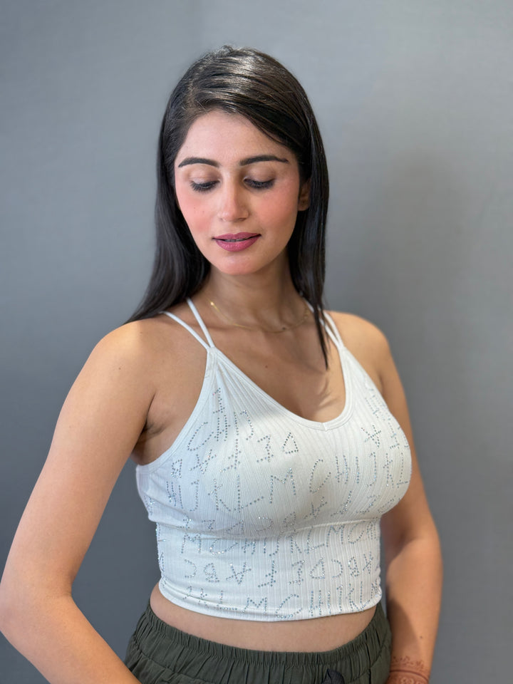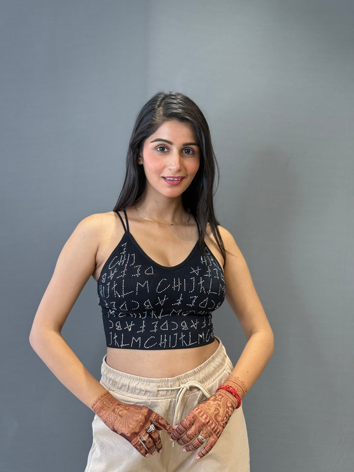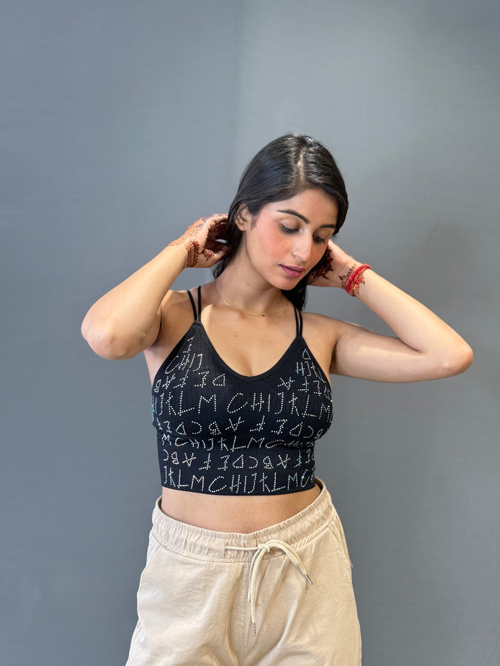 Stand out with this black alphabet graphic crop top, blending casual comfort with a trendy edge. Designed with a snug fit and spaghetti straps, this crop top features unique alphabet-inspired graphics across the front, giving it a modern street-style vibe. Perfect for pairing with cargos, joggers, or denim, it’s a versatile piece for everyday fashion.