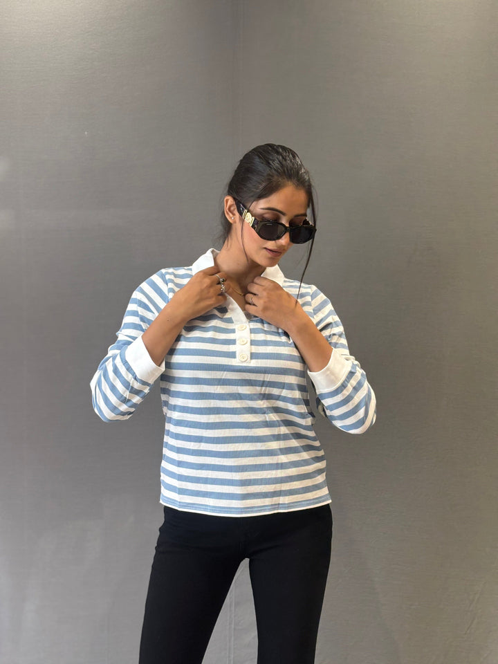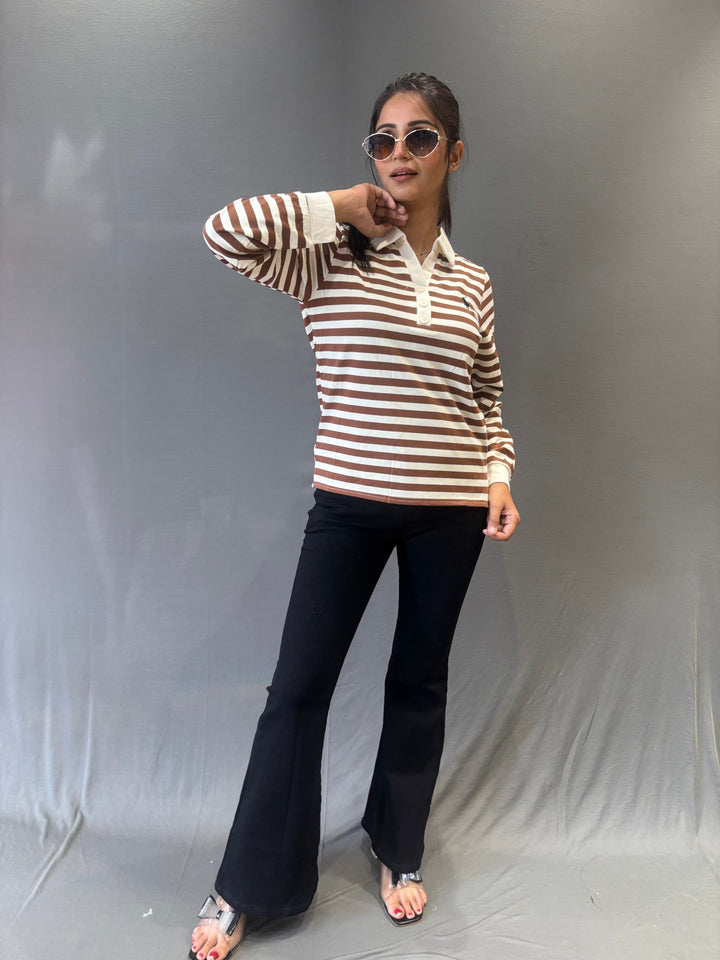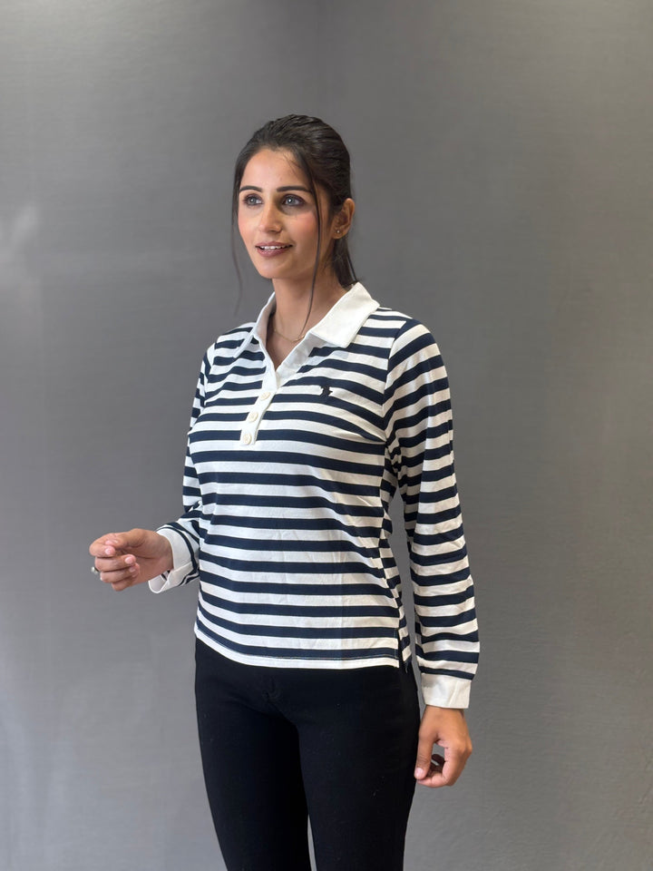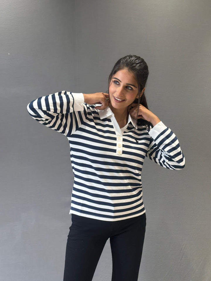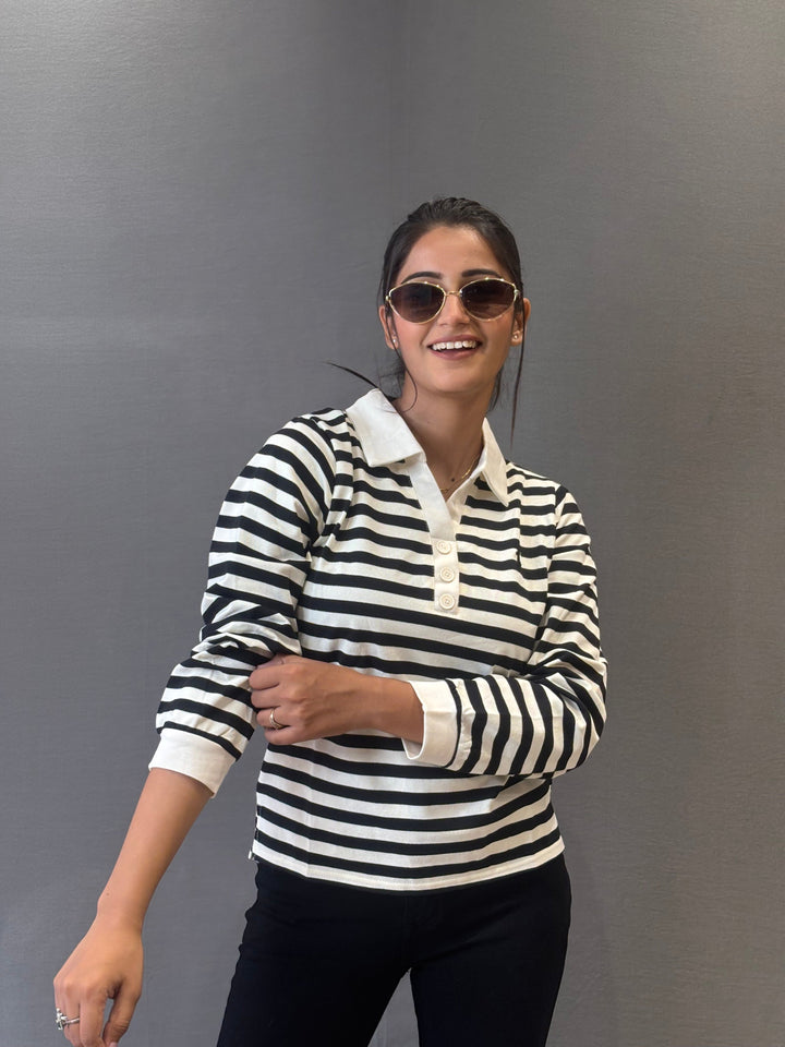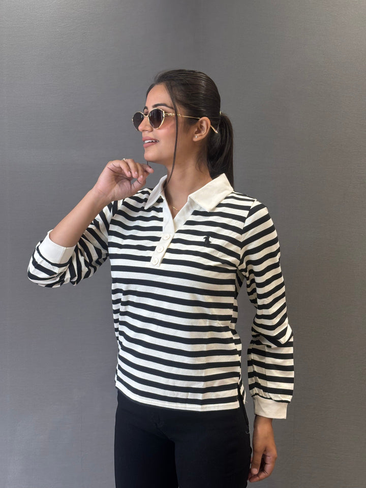 Elevate your casual style with this chic black and white striped polo top. Featuring a classic collared neckline, button placket, and long sleeves, this piece blends timeless design with everyday comfort. Made from soft, breathable fabric, it’s perfect for effortless pairing with jeans, skirts, or trousers. Ideal for brunch dates, casual Fridays, or laid-back weekends, this versatile top will be your go-to wardrobe staple.