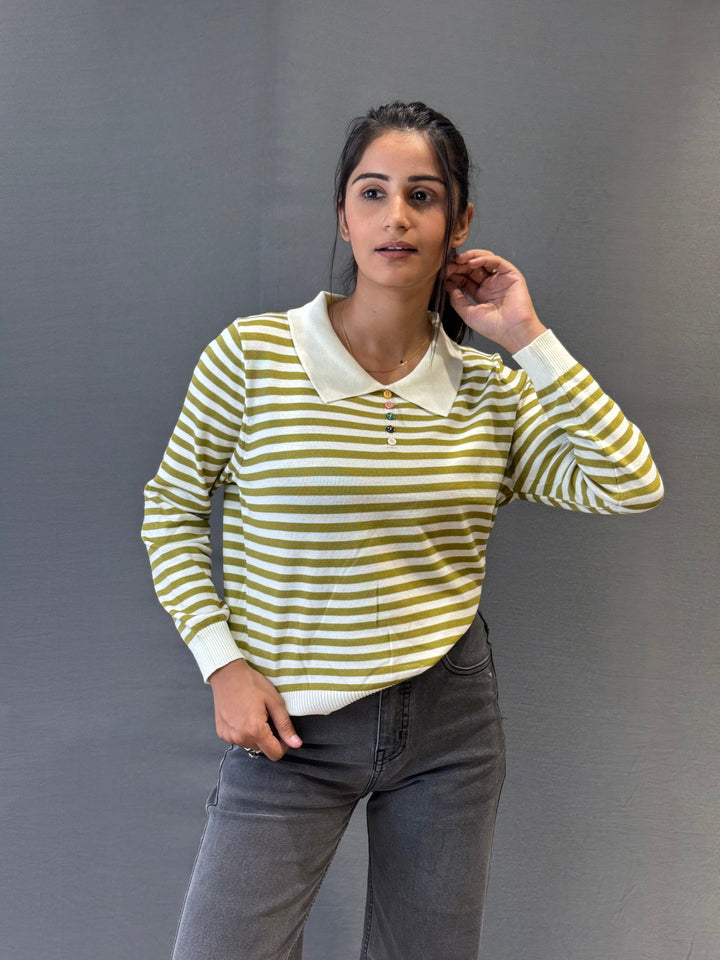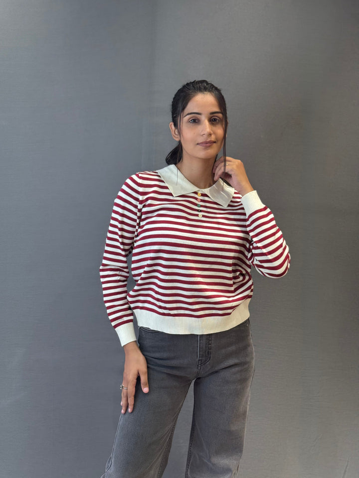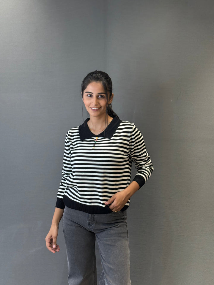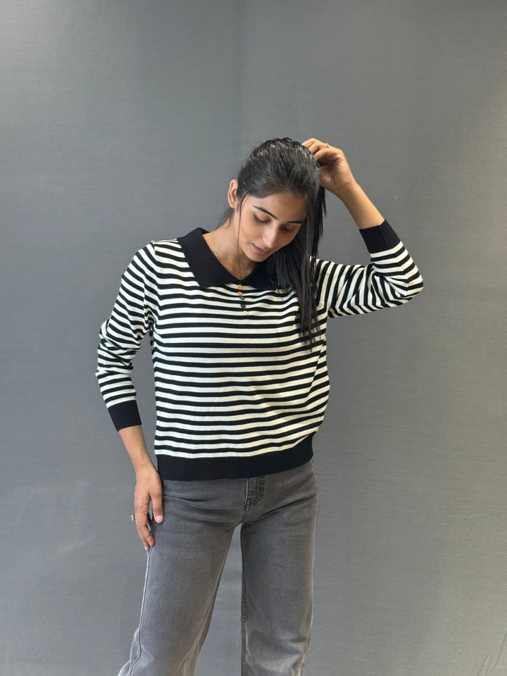 Stay effortlessly stylish with this striped collared knit top, designed for both comfort and charm. Featuring classic horizontal stripes, a contrasting point collar, and a neat front button placket, this top adds a preppy twist to everyday wear. Soft ribbed cuffs and hem provide a snug fit, while the lightweight knit fabric ensures all-day comfort. Perfect for pairing with jeans, trousers, or skirts, this versatile piece transitions seamlessly from casual outings to smart-casual occasions. Available in multiple color variants to suit your style.