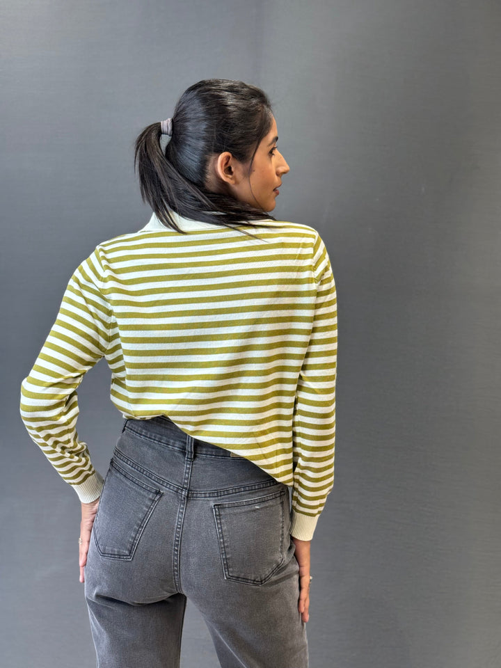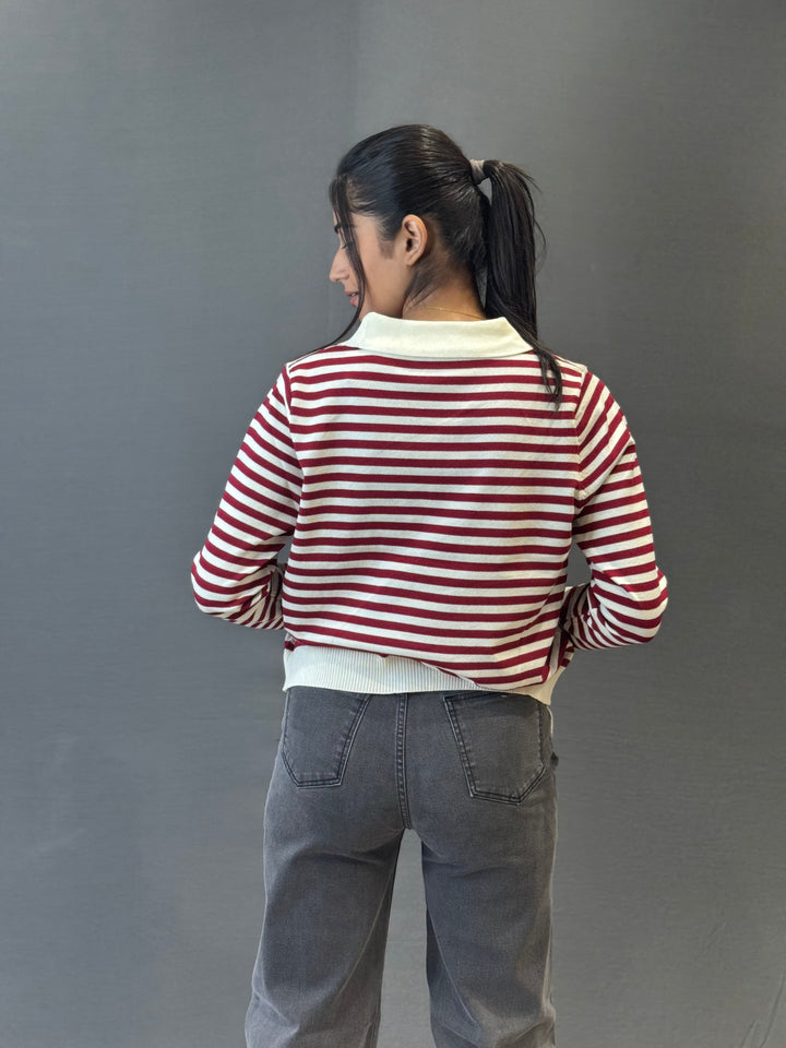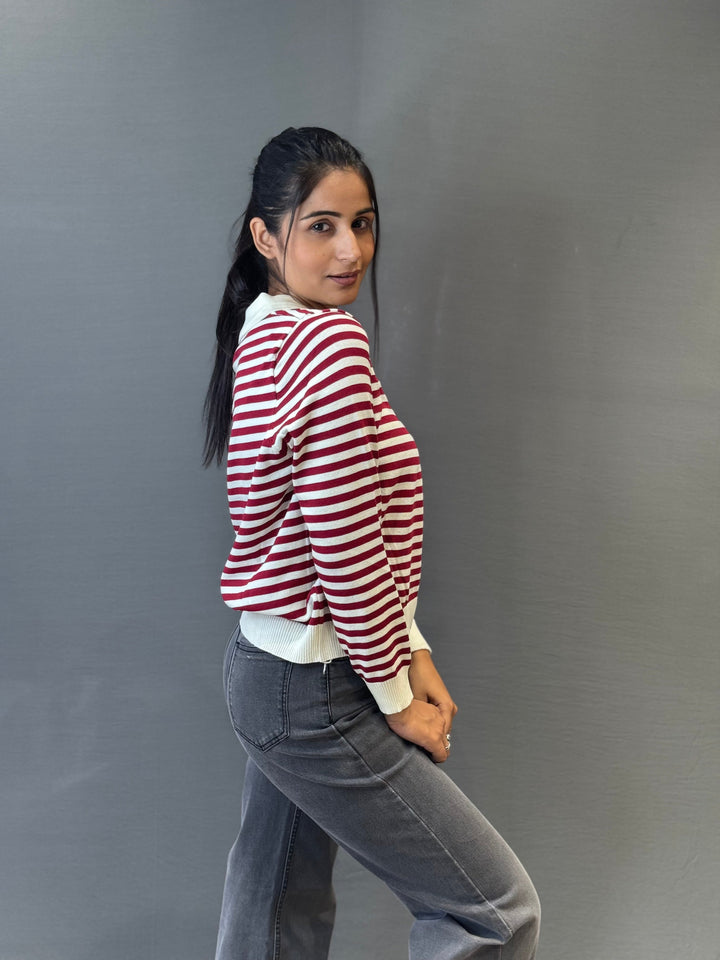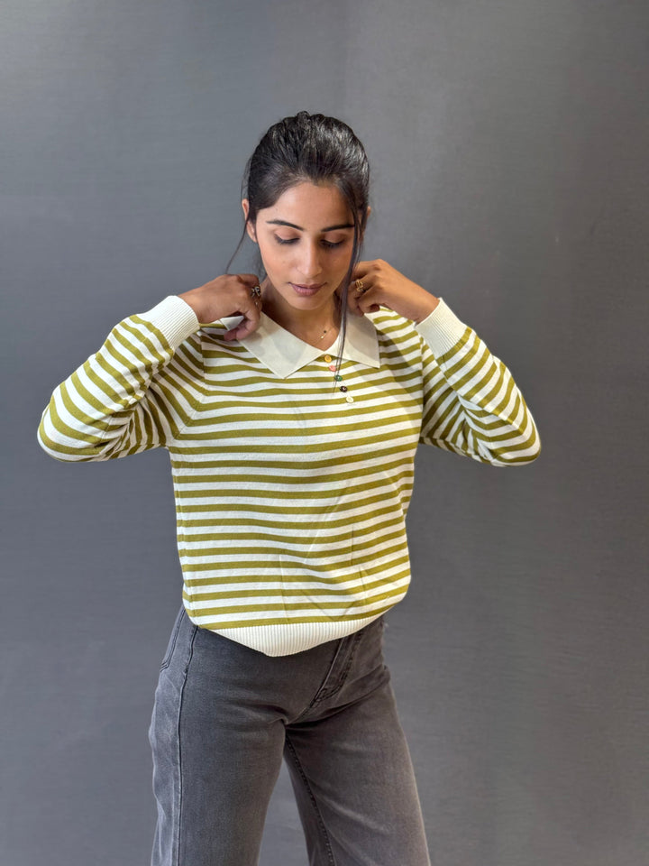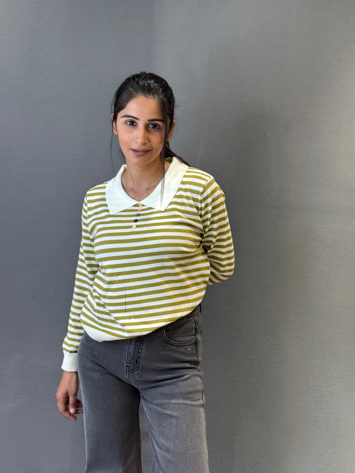 Stay effortlessly stylish with this striped collared knit top, designed for both comfort and charm. Featuring classic horizontal stripes, a contrasting point collar, and a neat front button placket, this top adds a preppy twist to everyday wear. Soft ribbed cuffs and hem provide a snug fit, while the lightweight knit fabric ensures all-day comfort. Perfect for pairing with jeans, trousers, or skirts, this versatile piece transitions seamlessly from casual outings to smart-casual occasions. Available in multiple color variants to suit your style.