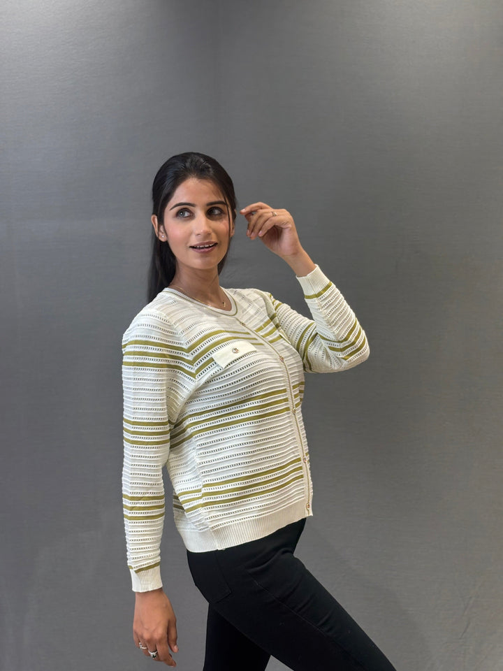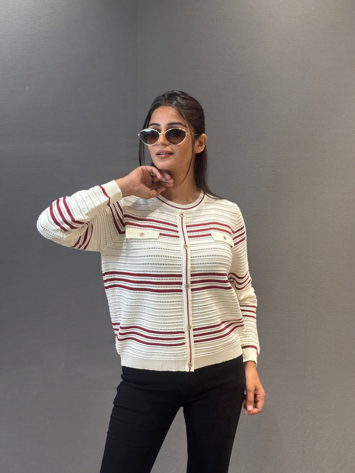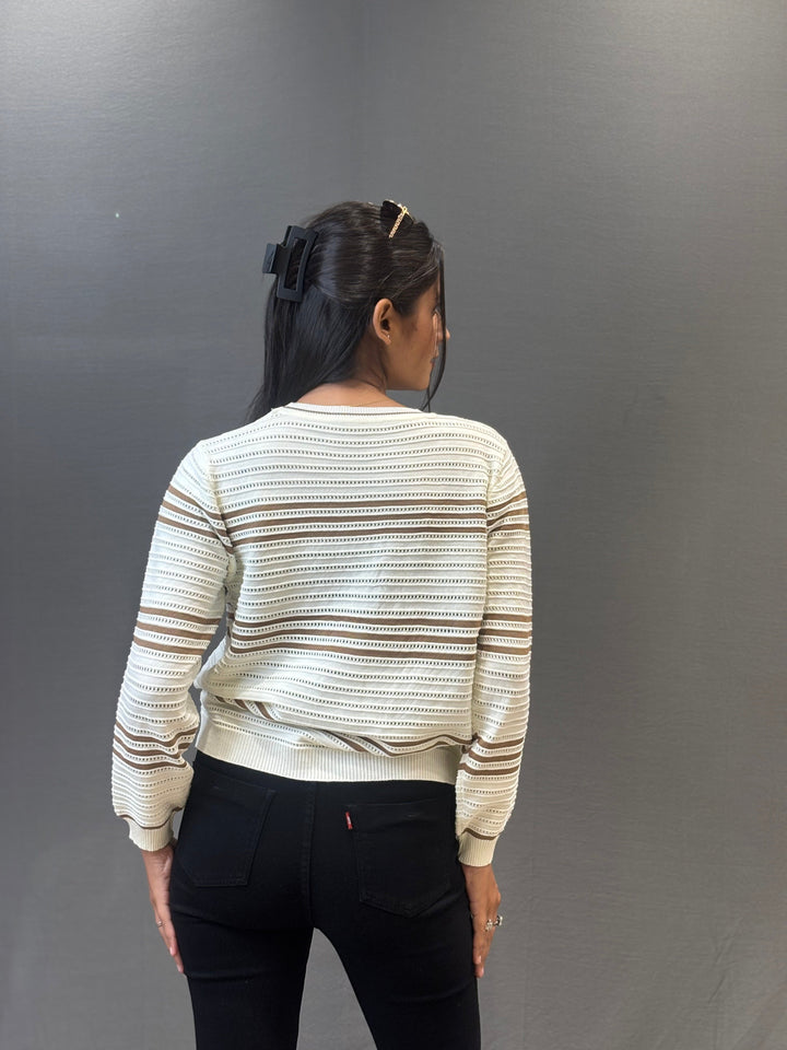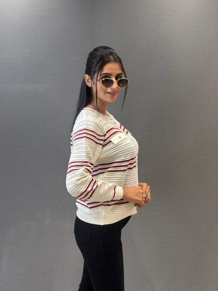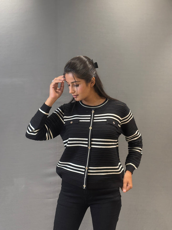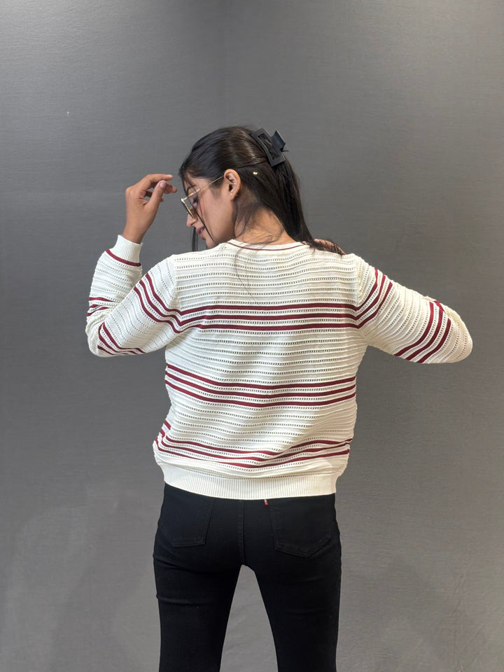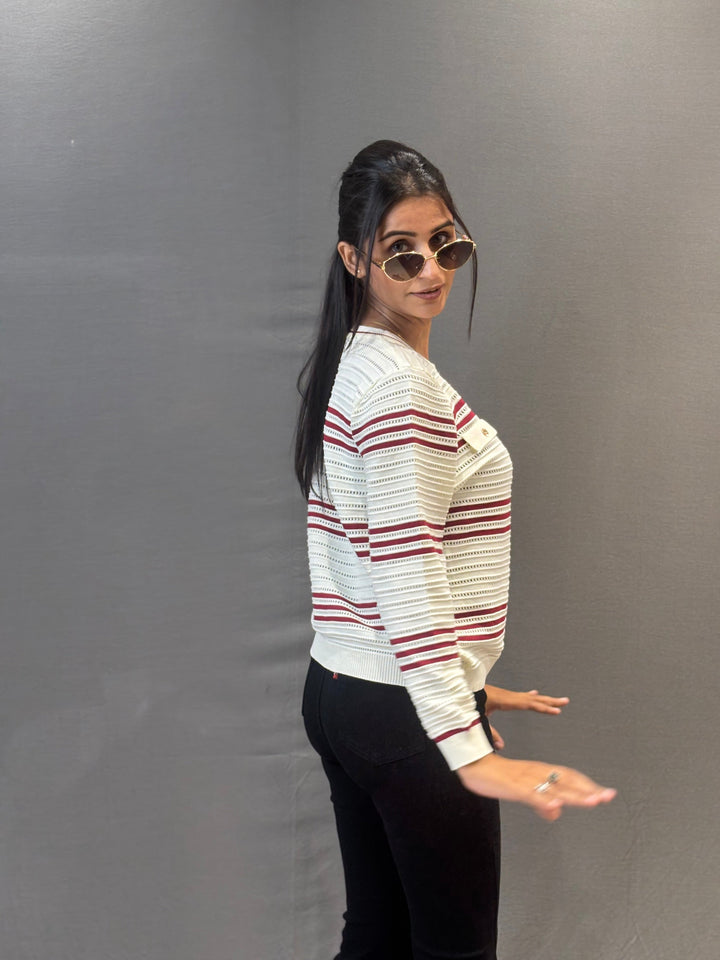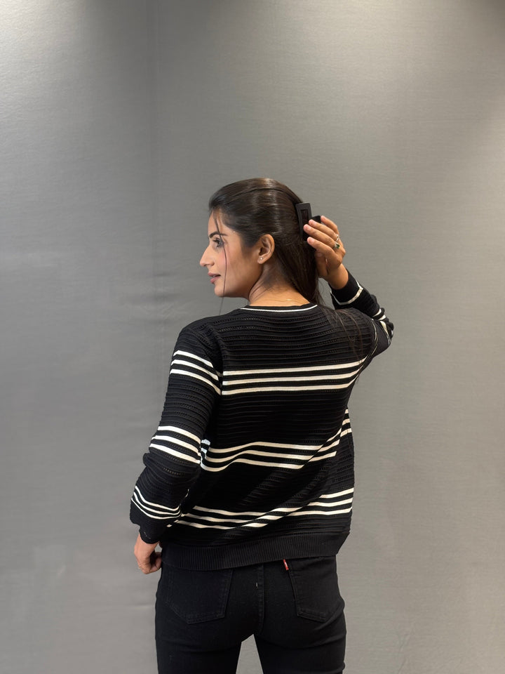 Stay effortlessly stylish this season with our semi-winter striped knit top, designed for both comfort and versatility. Made from a soft, breathable knit, this piece keeps you warm without feeling bulky – perfect for layering or wearing on its own. The timeless stripe pattern and tailored fit make it easy to dress up for work or pair with jeans for a casual day out.