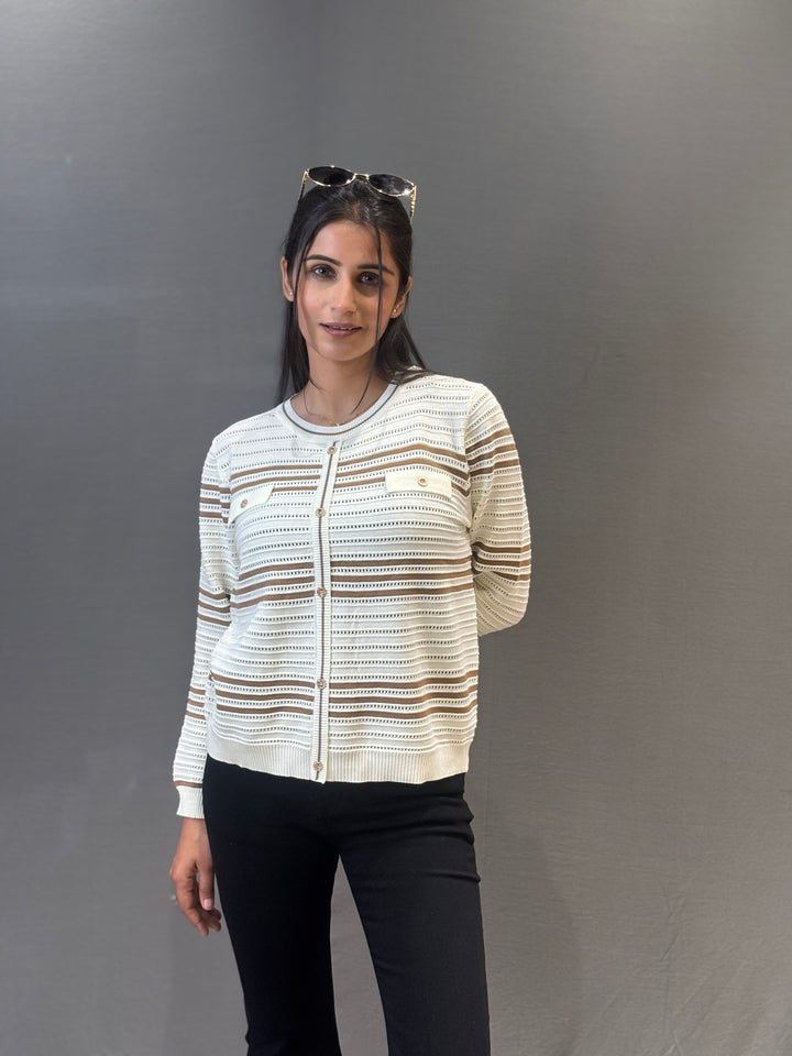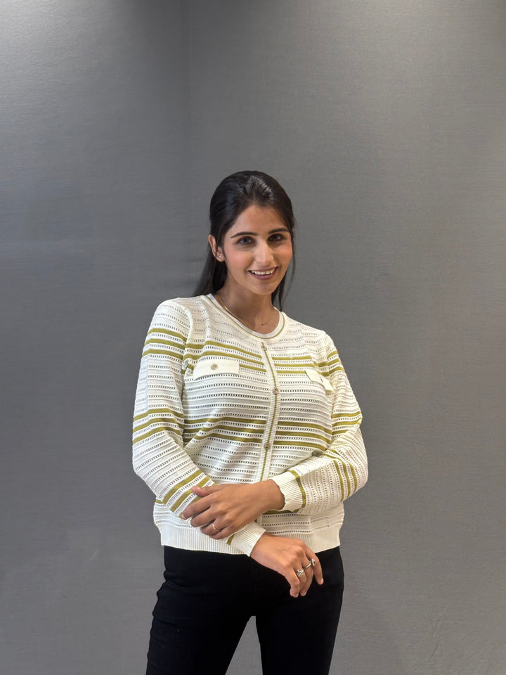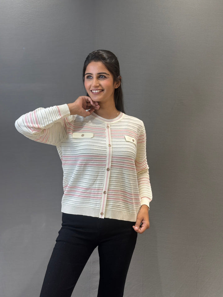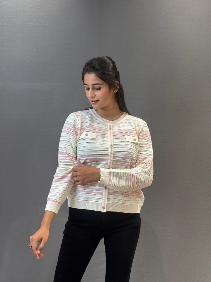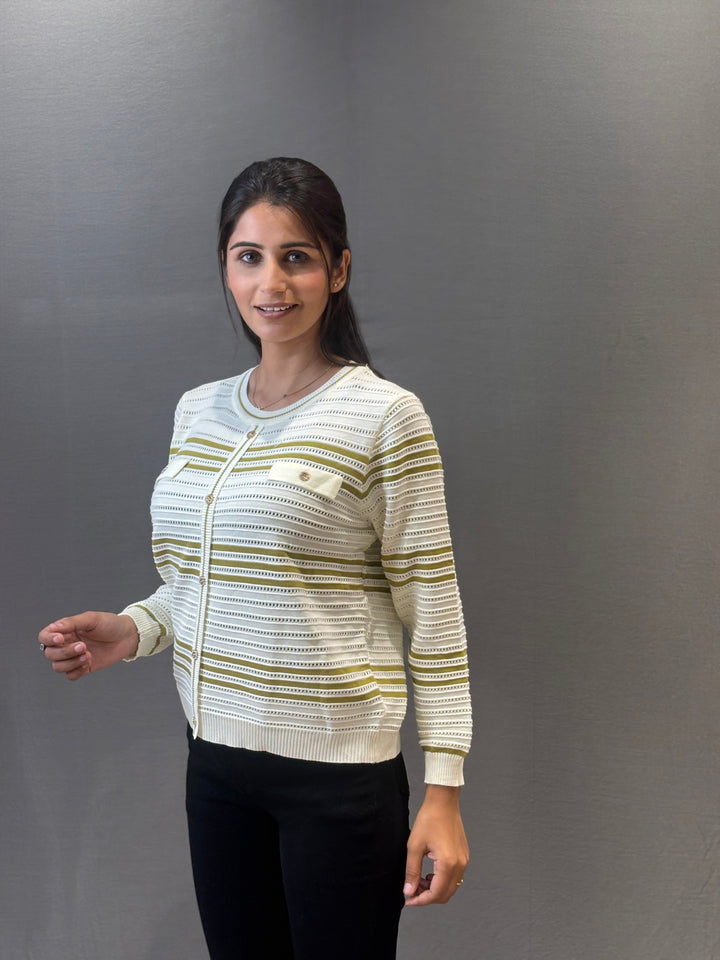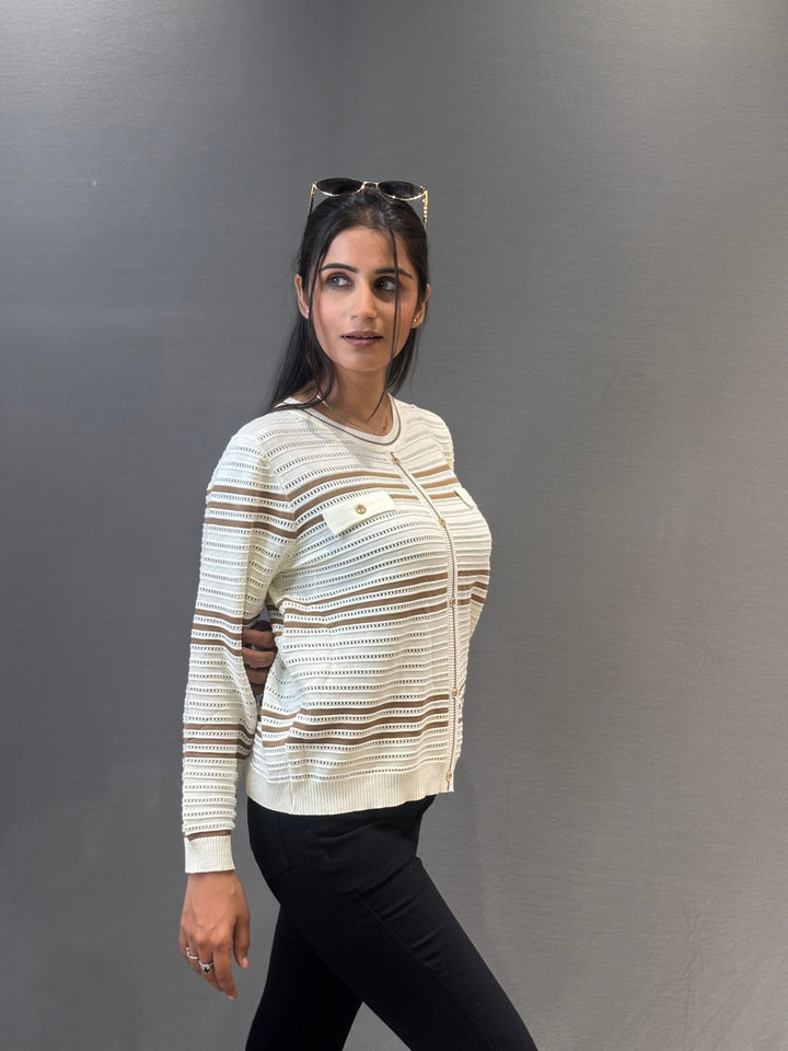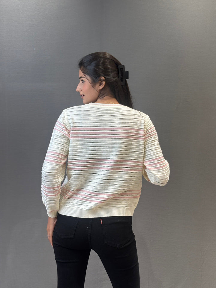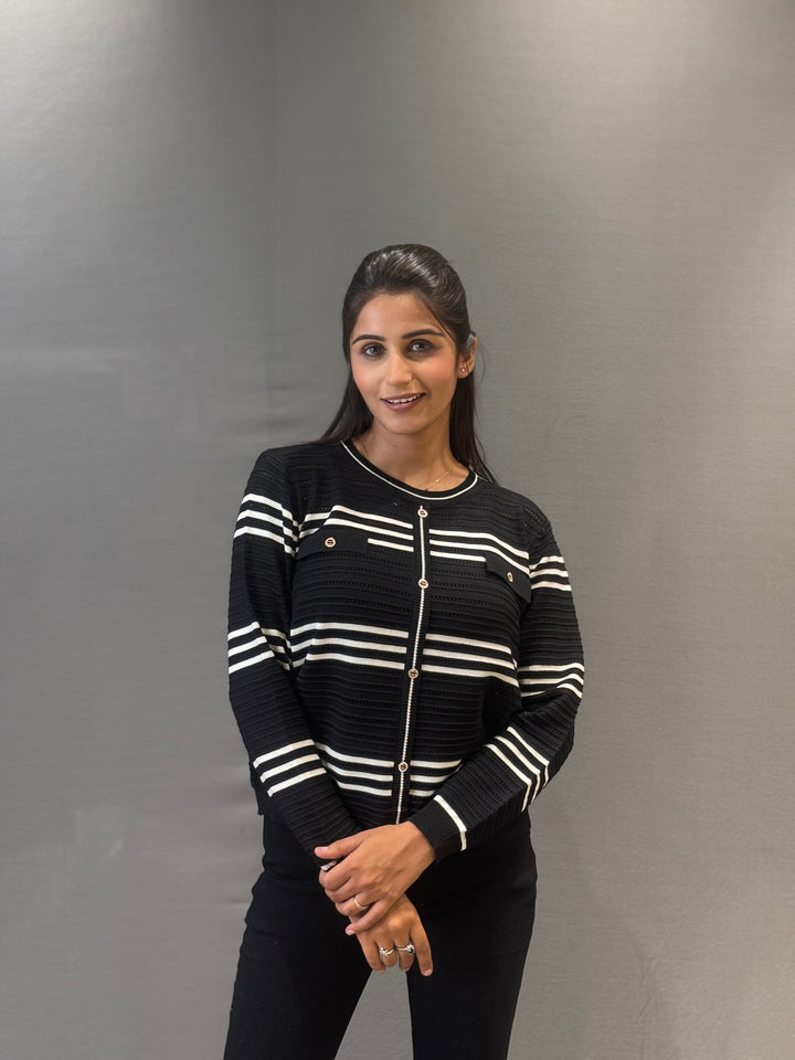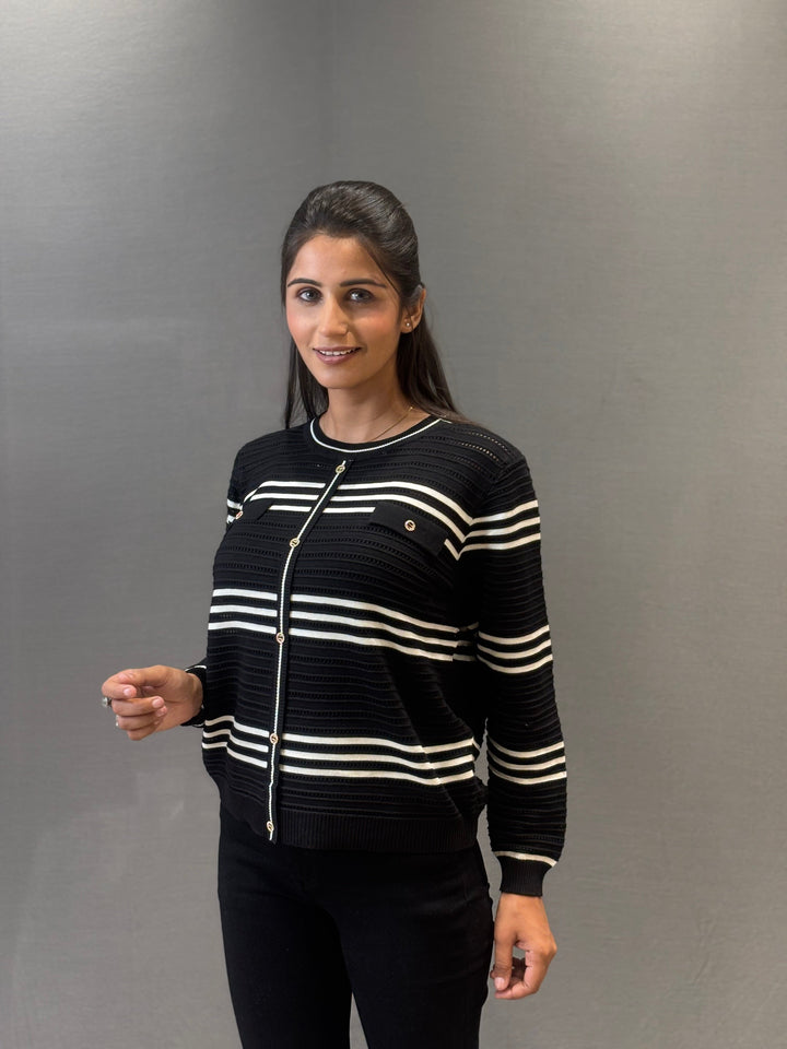 Stay effortlessly stylish this season with our semi-winter striped knit top, designed for both comfort and versatility. Made from a soft, breathable knit, this piece keeps you warm without feeling bulky – perfect for layering or wearing on its own. The timeless stripe pattern and tailored fit make it easy to dress up for work or pair with jeans for a casual day out.