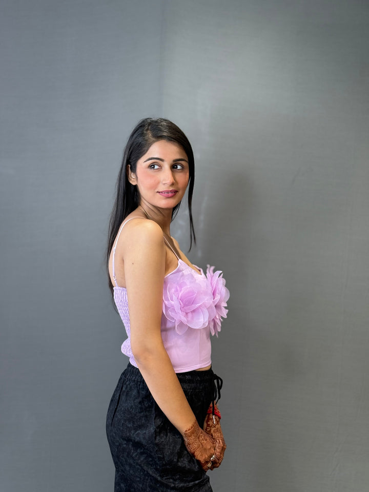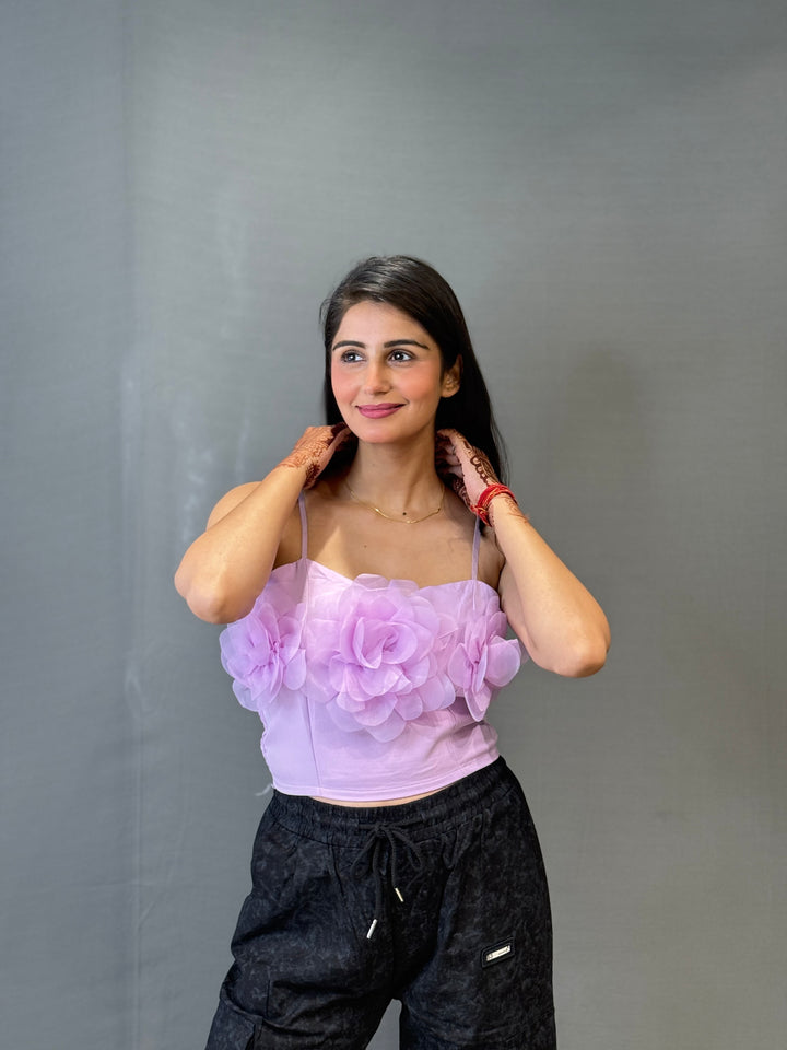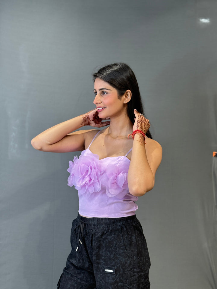 Turn heads with this stunning lavender floral crop top, designed to bring elegance with a playful twist. Featuring delicate spaghetti straps and bold 3D flower appliqués across the bust, this top combines femininity and trend-setting style. The fitted silhouette makes it perfect for pairing with high-waisted pants, skirts, or shorts, making it a versatile piece for both casual and party wear.