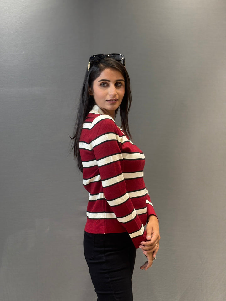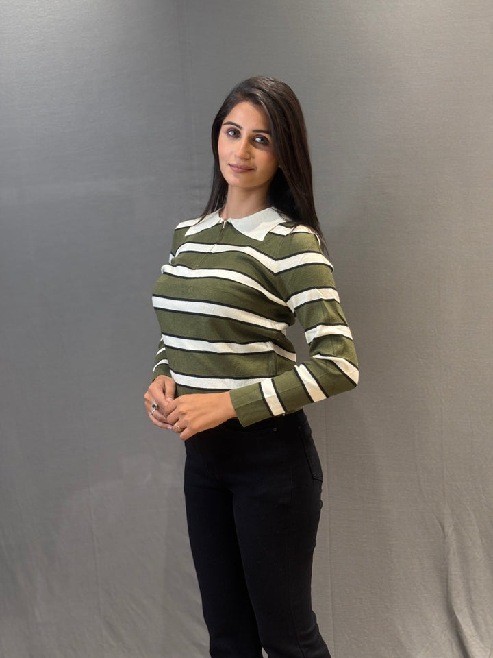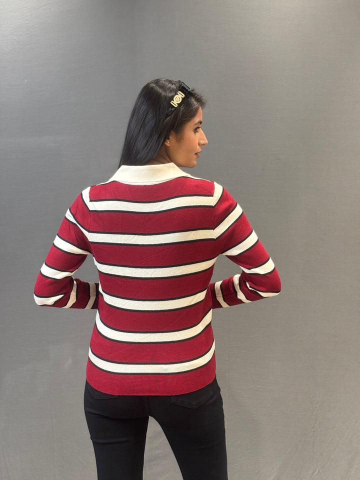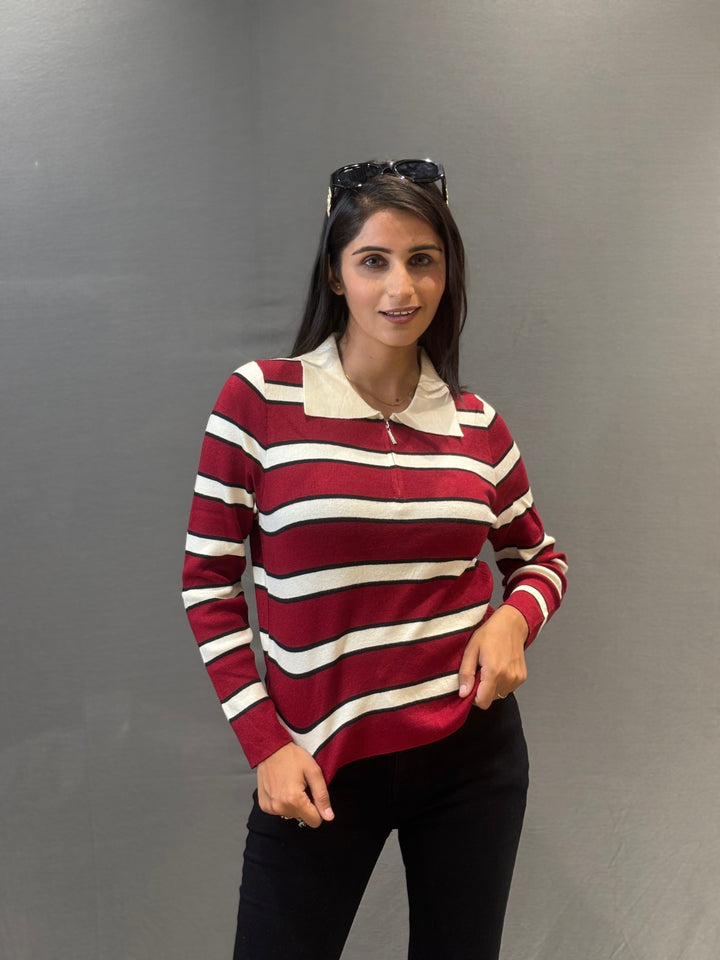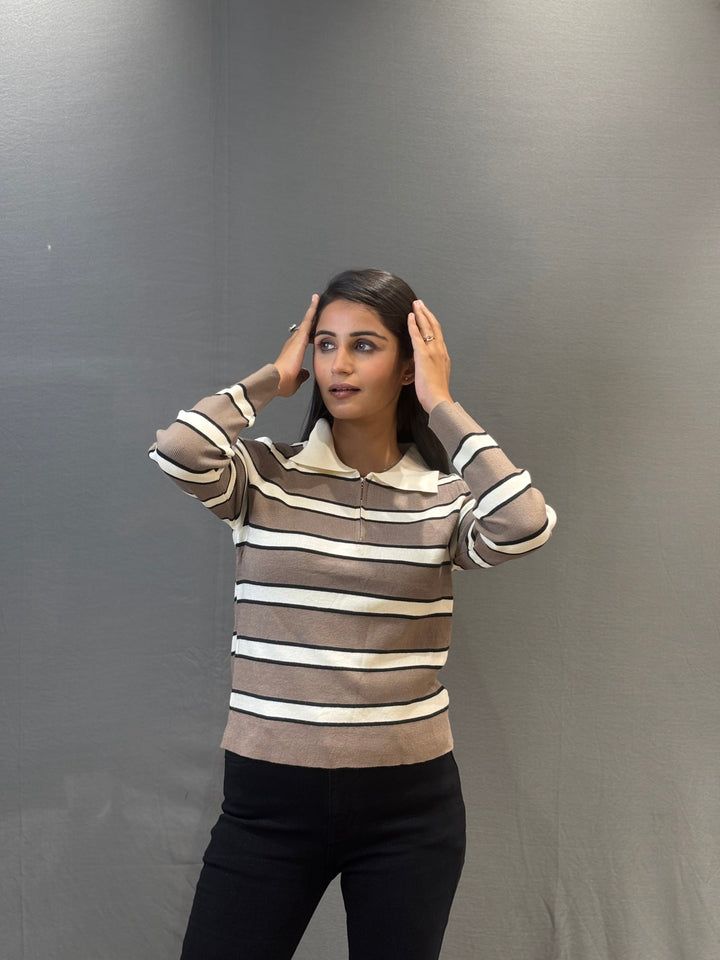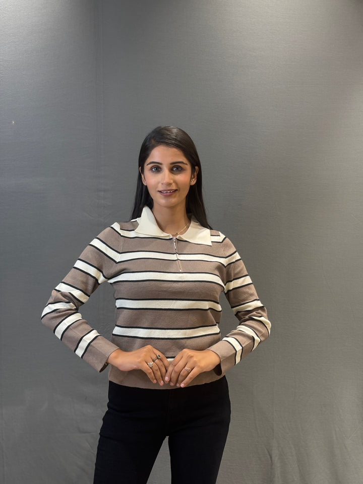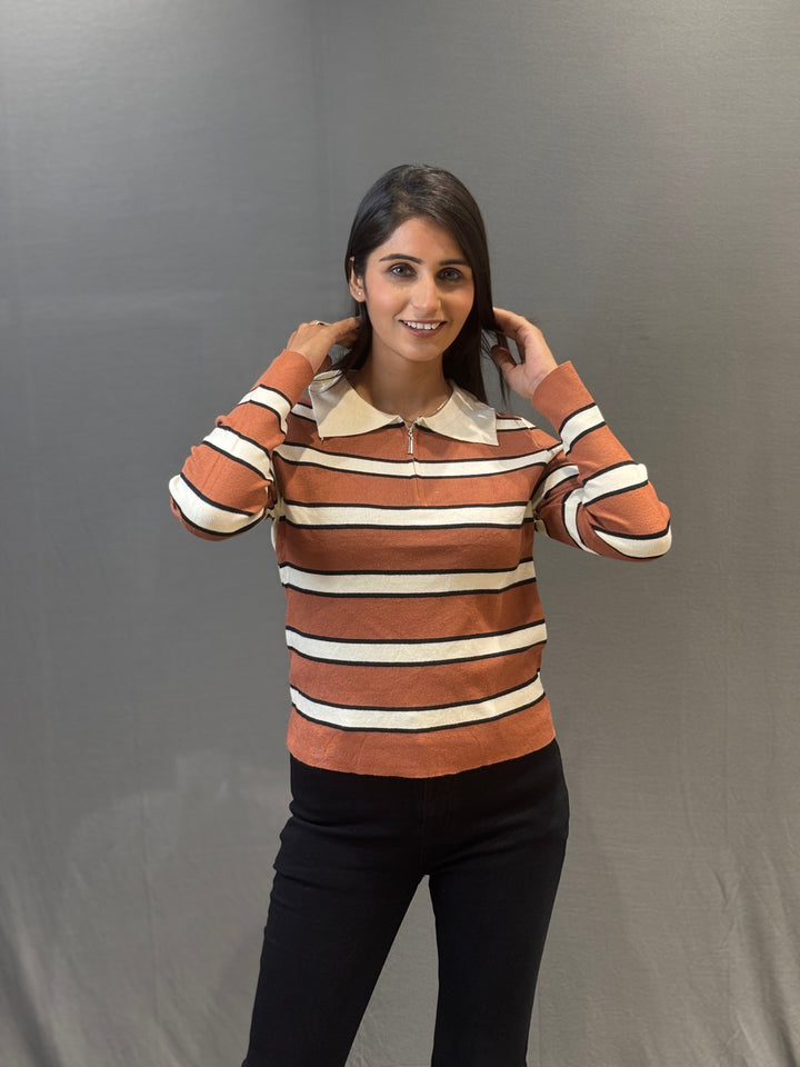 Stay cozy and stylish with our Women’s Striped Knit Sweater, designed with a classic collared neckline for a chic twist. Made from soft, breathable knit fabric, this top is perfect for layering or wearing on its own. The timeless horizontal stripe pattern adds a touch of casual charm, making it ideal for work, outings, or relaxed weekends.