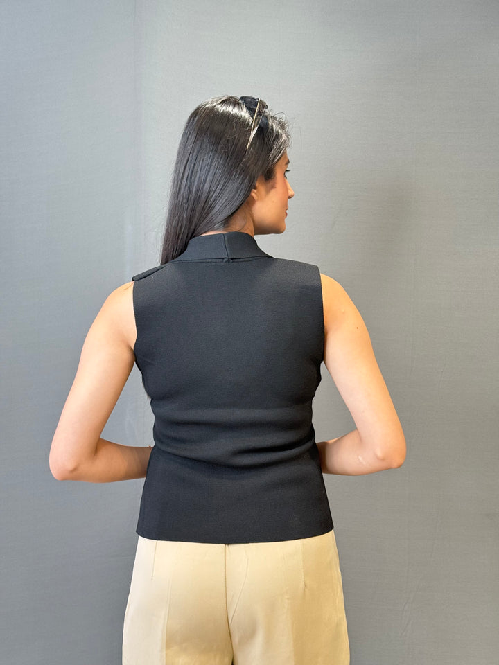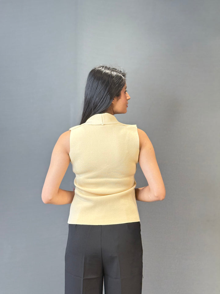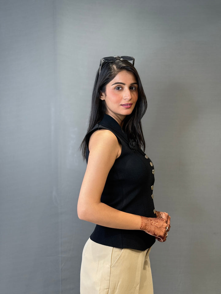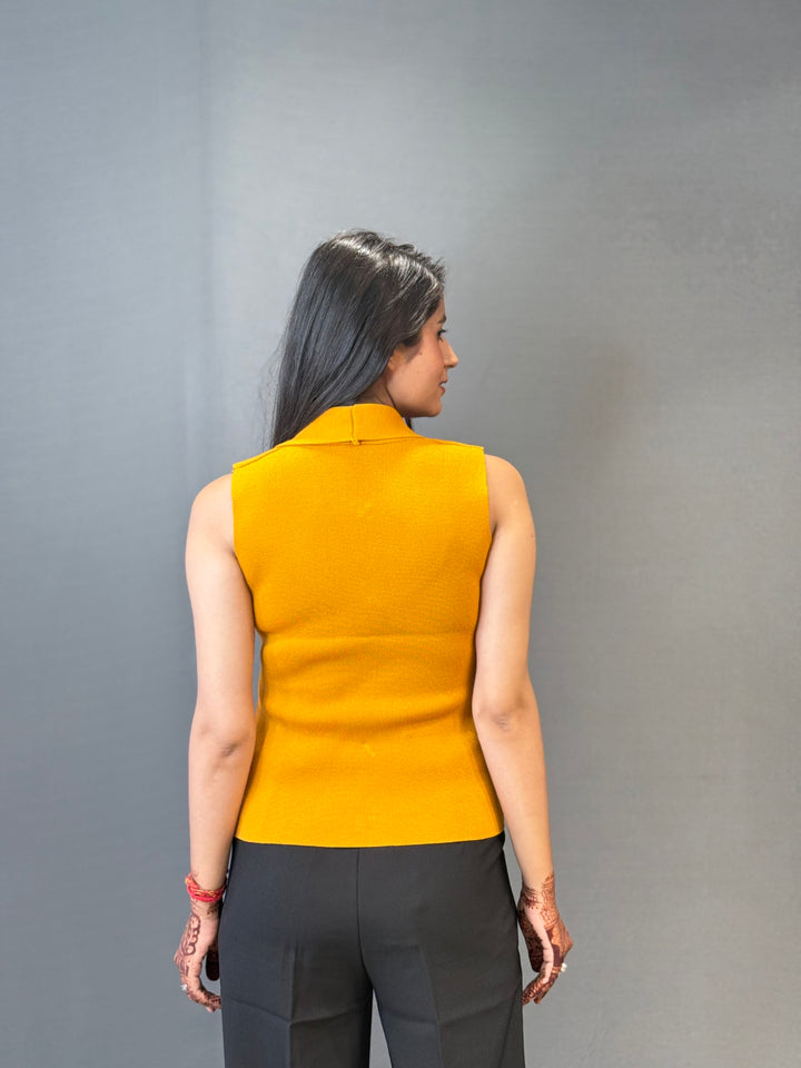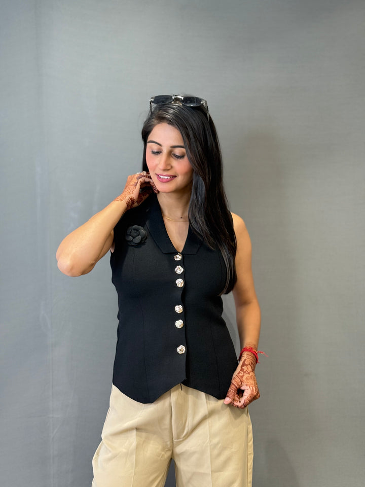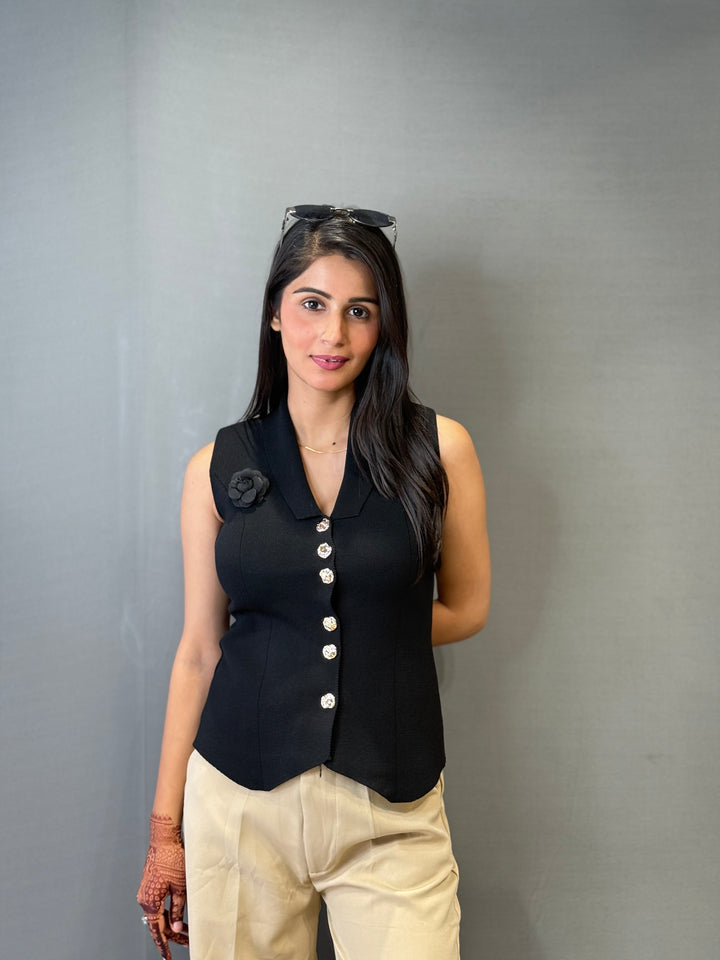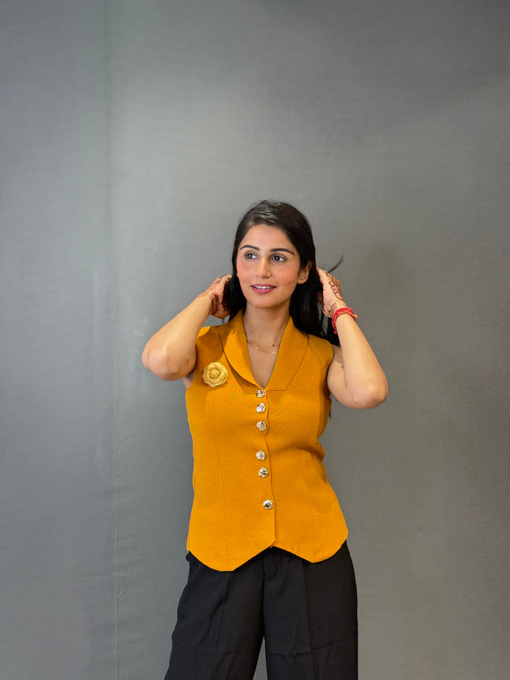 Step into effortless elegance with this mustard yellow sleeveless button-down top. Designed with a tailored fit and a flattering V-neckline, this piece combines modern style with timeless charm. The statement buttons and delicate flower embellishment on the shoulder add a unique, feminine touch.